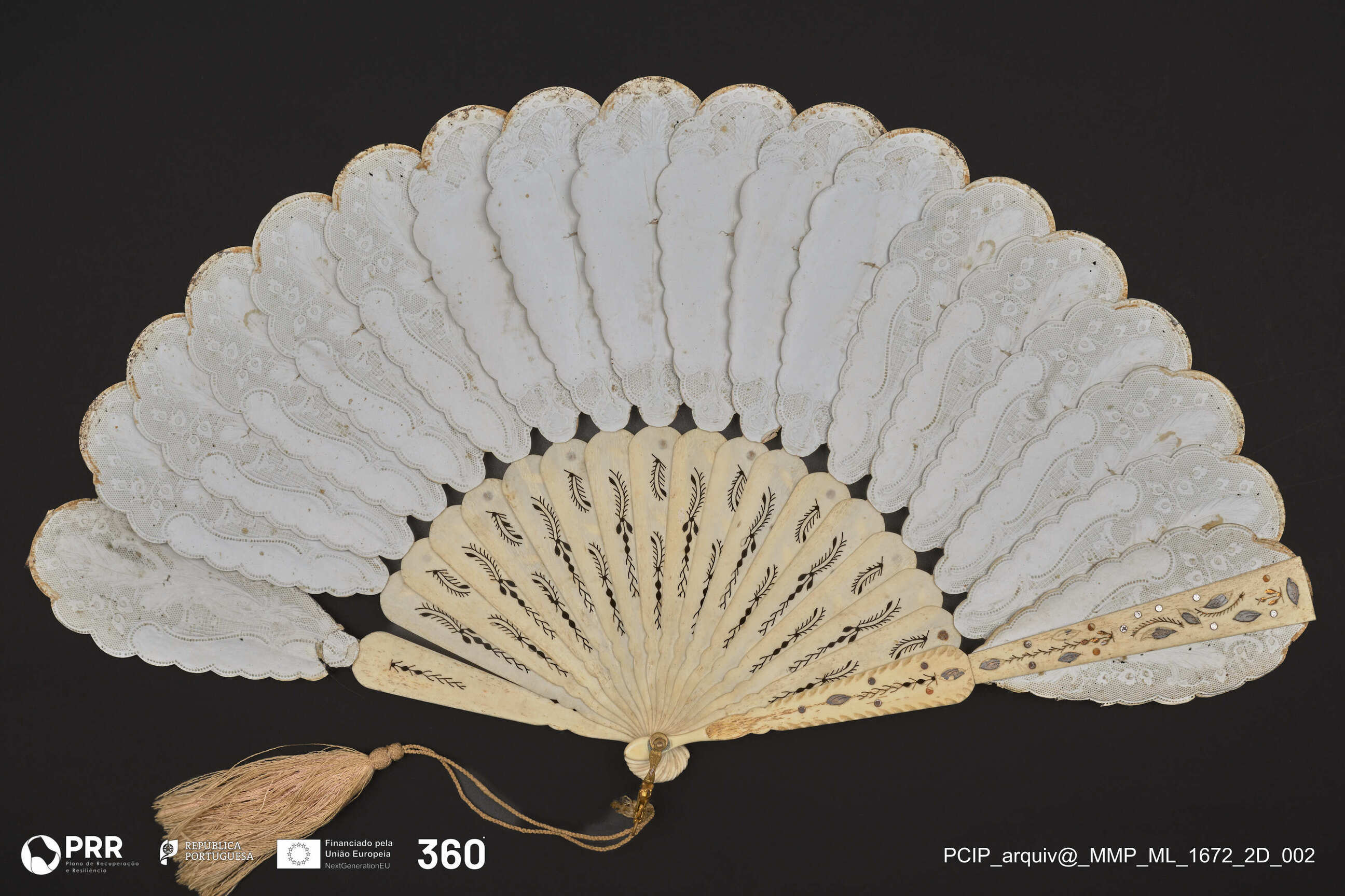 Matéria/Técnica: Marfim esculpido, vazado, pintado e incrustado (piqué). Palmetas douradas. Pintura com cena galante nas palmetas centrais.; Cronologia: 1850-1860; Autoria: Desconhecida; Dimensões (cm): Altura: 29 x Largura: 49,5.