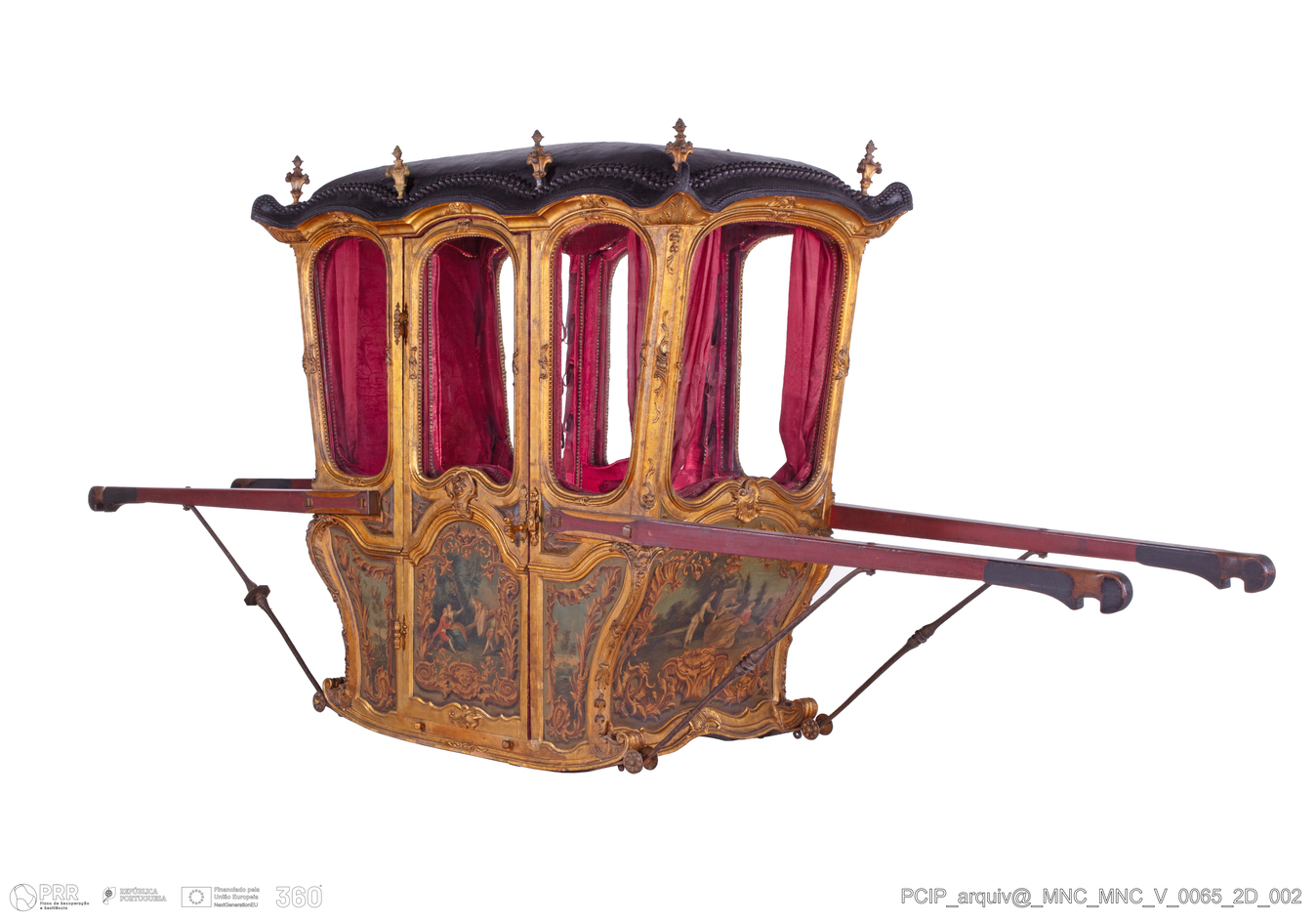 Matéria/ Técnica: Madeira; couro; bronze; damasco; tafetá de seda; vidro; Cronologia: 1750 - 1775; Autoria: Desconhecida; Dimensões (cm): Altura: 184; Largura: 98; Comprimento: 415; Outras dimensões: 184 X 98 X 179 (caixa).