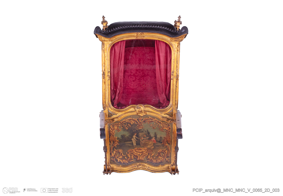 Matéria/ Técnica: Madeira; couro; bronze; damasco; tafetá de seda; vidro; Cronologia: 1750 - 1775; Autoria: Desconhecida; Dimensões (cm): Altura: 184; Largura: 98; Comprimento: 415; Outras dimensões: 184 X 98 X 179 (caixa).