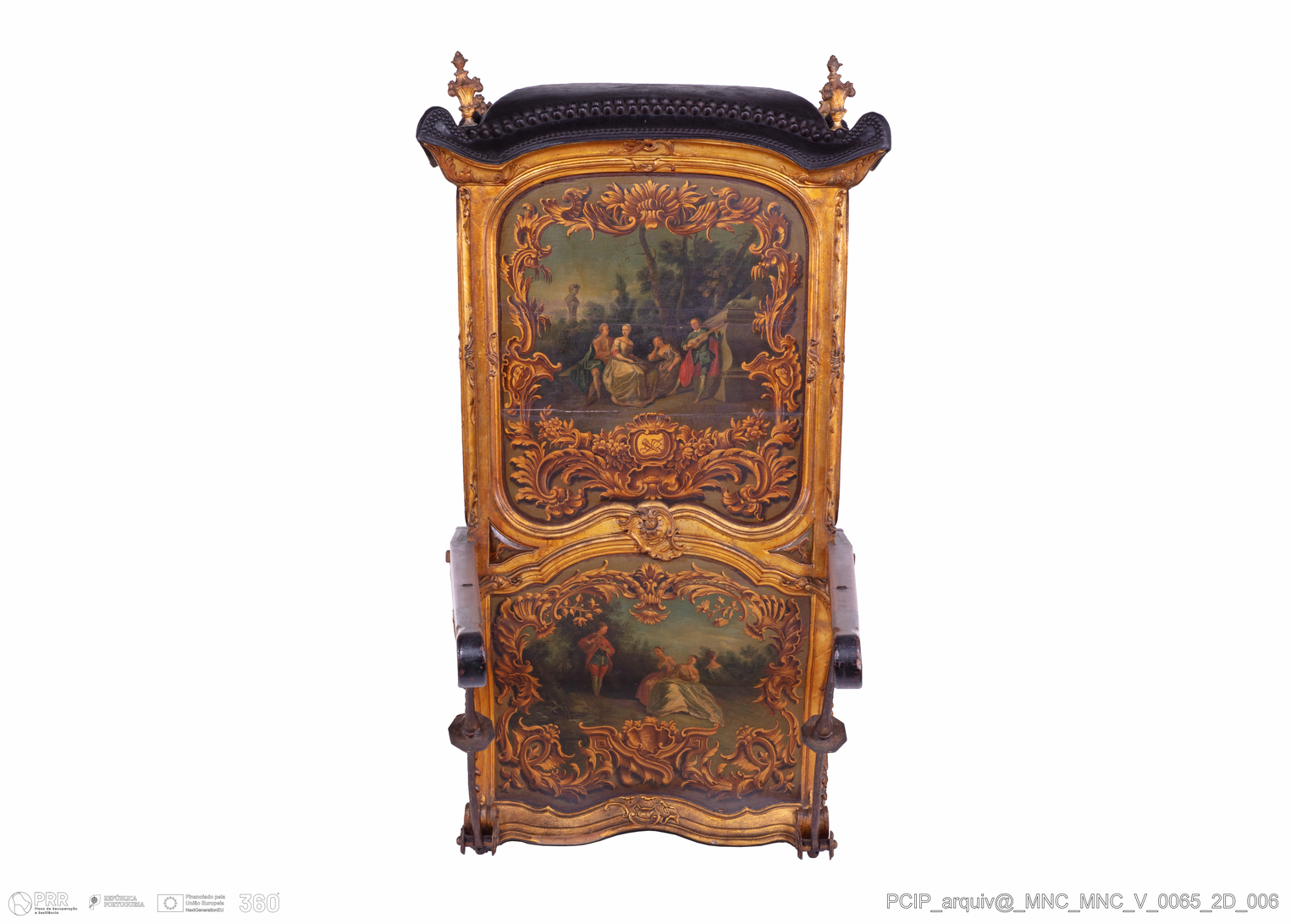 Matéria/ Técnica: Madeira; couro; bronze; damasco; tafetá de seda; vidro; Cronologia: 1750 - 1775; Autoria: Desconhecida; Dimensões (cm): Altura: 184; Largura: 98; Comprimento: 415; Outras dimensões: 184 X 98 X 179 (caixa).