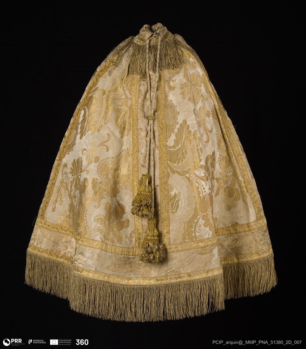 Matéria/Técnica: Lampasso adamascado espolinado, composto por fios de seda, fios laminados e fios crespos dourados; passamanaria (galão, cordão, franja, borlas) em fio de seda, lâmina e fio laminado de metal dourado; tafetá (forro); Cronologia: Século XVIII; Autoria: Desconhecida; Dimensões: Altura: 81 cm x Largura: 94 cm.