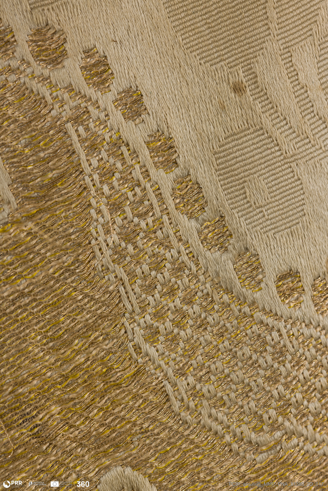 Matéria/Técnica: Lampasso adamascado espolinado, composto por fios de seda, fios laminados e fios crespos dourados; passamanaria (galão, cordão, franja, borlas) em fio de seda, lâmina e fio laminado de metal dourado; tafetá (forro); Cronologia: Século XVIII; Autoria: Desconhecida; Dimensões: Altura: 81 cm x Largura: 94 cm.