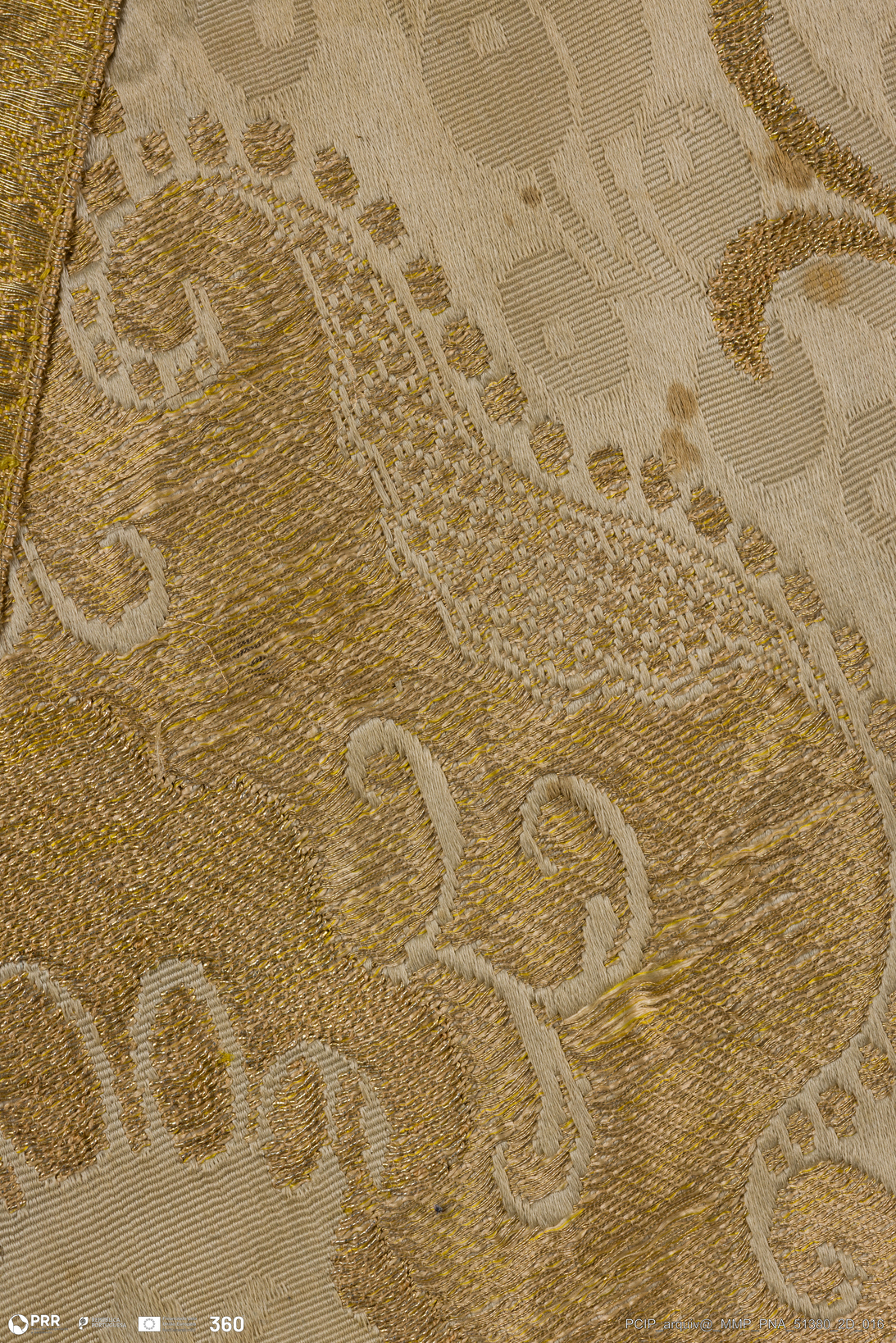 Matéria/Técnica: Lampasso adamascado espolinado, composto por fios de seda, fios laminados e fios crespos dourados; passamanaria (galão, cordão, franja, borlas) em fio de seda, lâmina e fio laminado de metal dourado; tafetá (forro); Cronologia: Século XVIII; Autoria: Desconhecida; Dimensões: Altura: 81 cm x Largura: 94 cm.