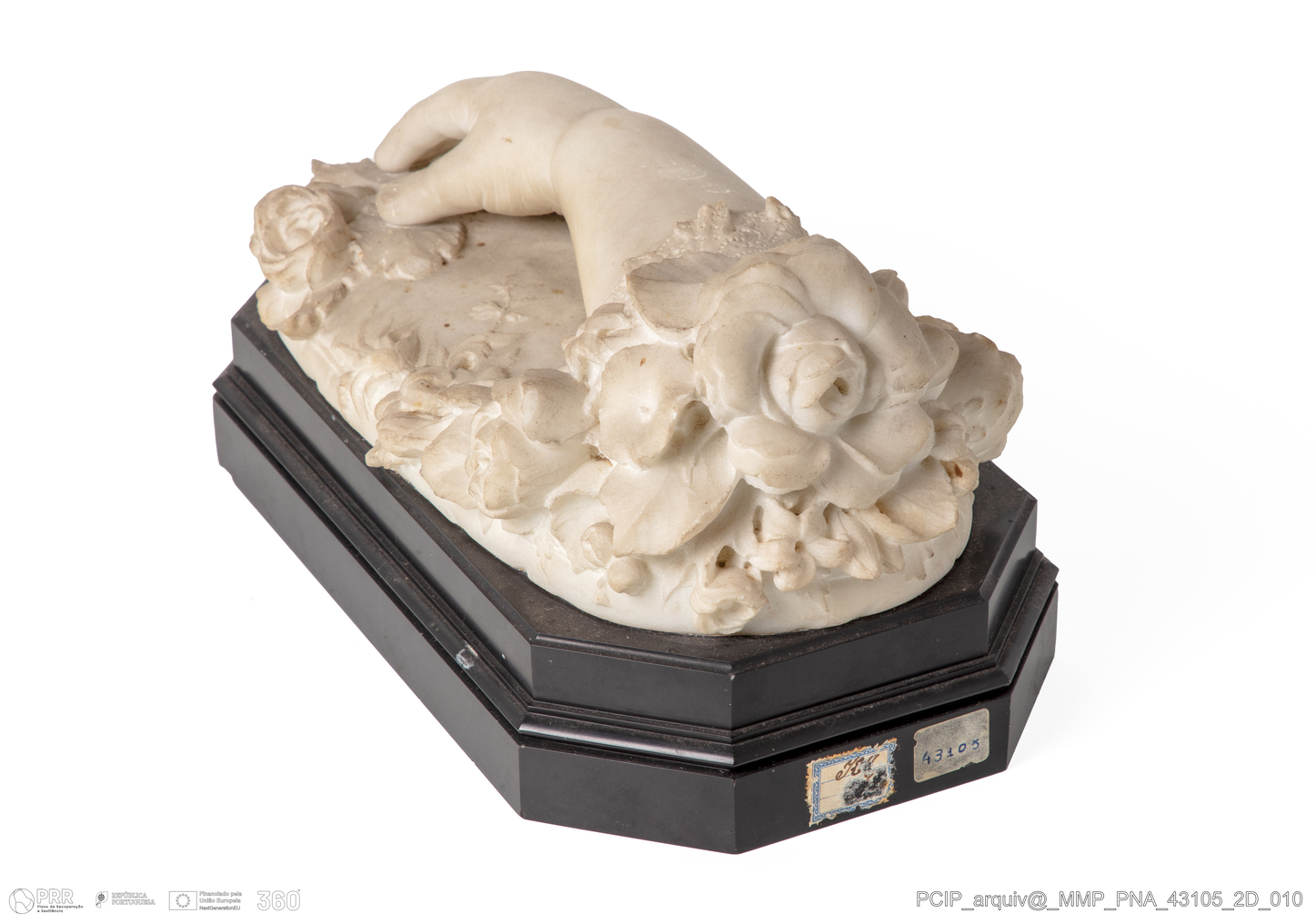 Matéria/Técnica: Mármore de Carrara; mármore preto; Cronologia: 1868; Autoria: Sighinolfi, Cesare (1835-1903) atribuível; Dimensões (cm): Altura: 9,5; Largura: 15; Comprimento: 16.
