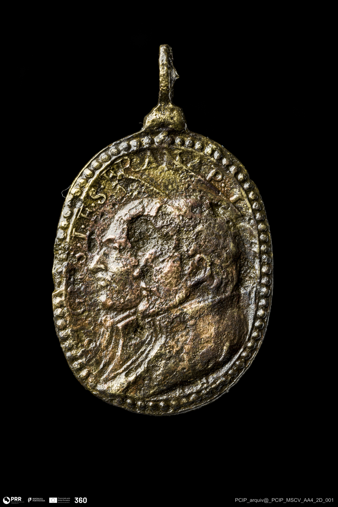 Matéria/Técnica: Liga de cobre; Cronologia: Século XVII; Autoria: Desconhecida; Dimensões: Largura: 20mm; Altura: 26mm.
