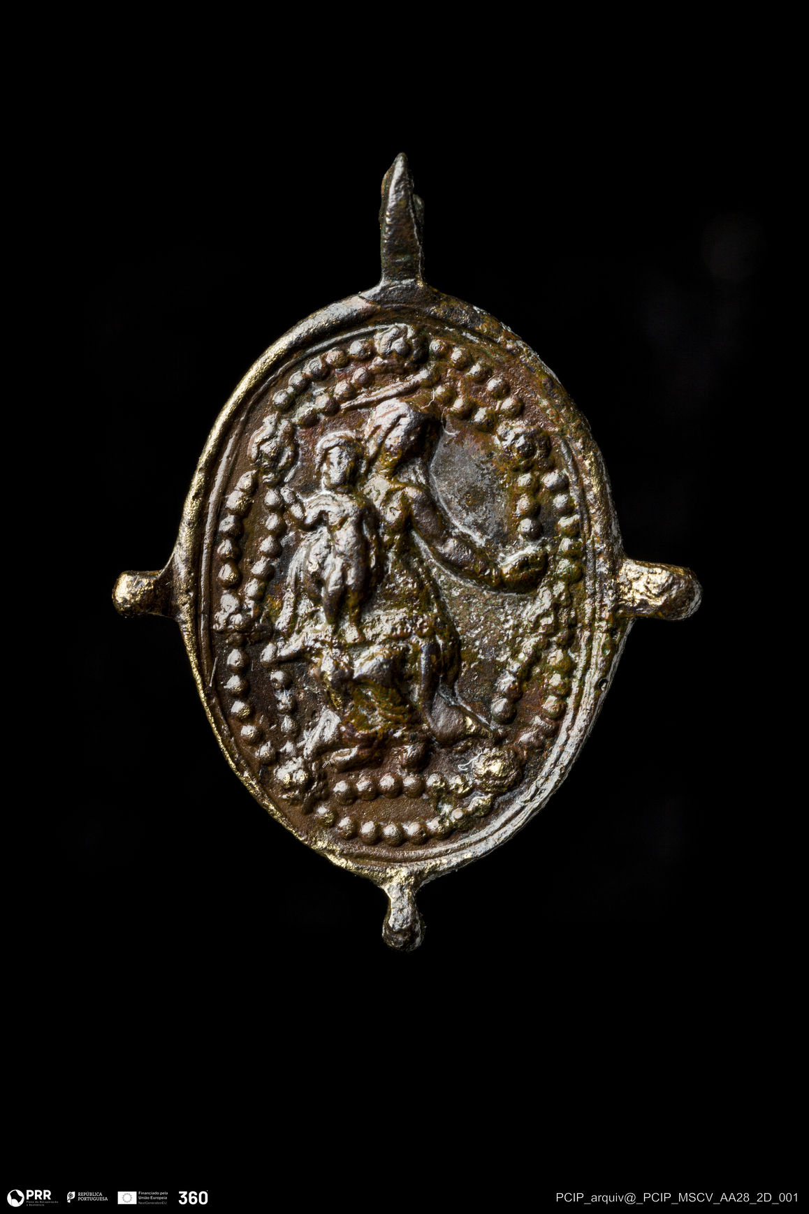 Matéria/Técnica: Liga de cobre; Cronologia: Século XVII; Autoria: Desconhecida; Dimensões: Largura: 14mm; Altura: 19mm.