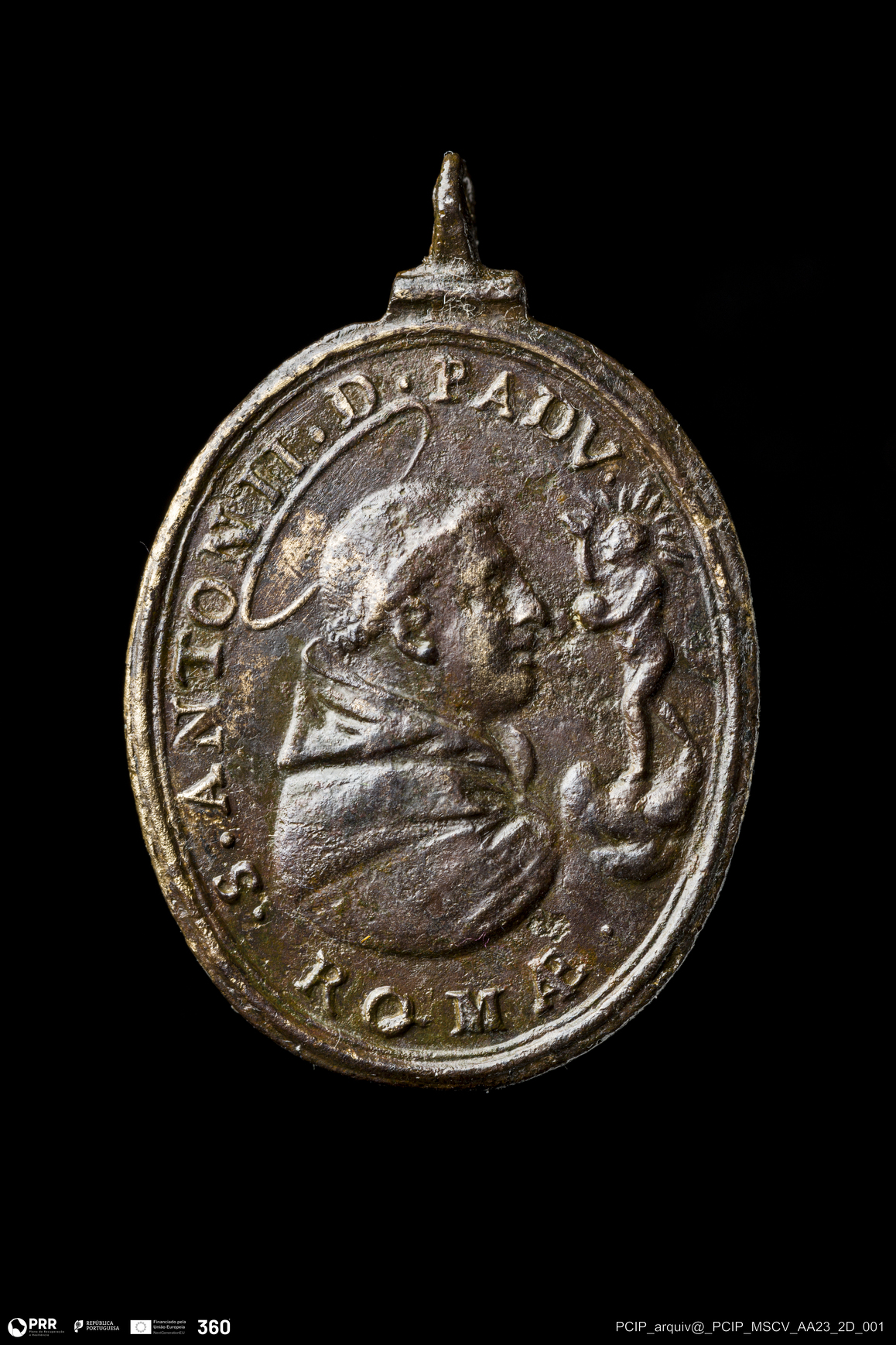 Matéria/Técnica: Liga de cobre; Cronologia: Século XVII - 1625; Autoria: Desconhecida; Dimensões: Largura: 26mm; Altura: 32mm.