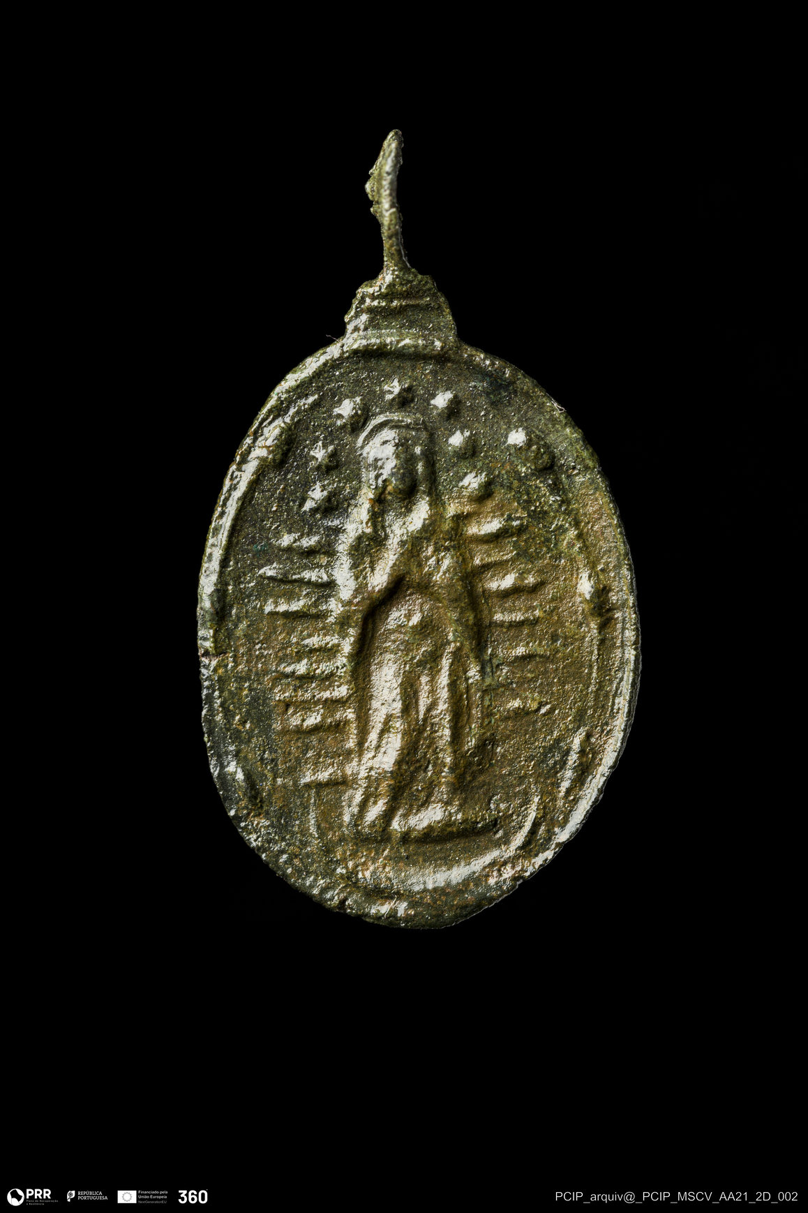 Matéria/Técnica: Liga de cobre; Cronologia: Final do Século XVI-Início do Século XVII (?); Autoria: Desconhecida; Dimensões: Largura: 16mm; Altura: 21mm.