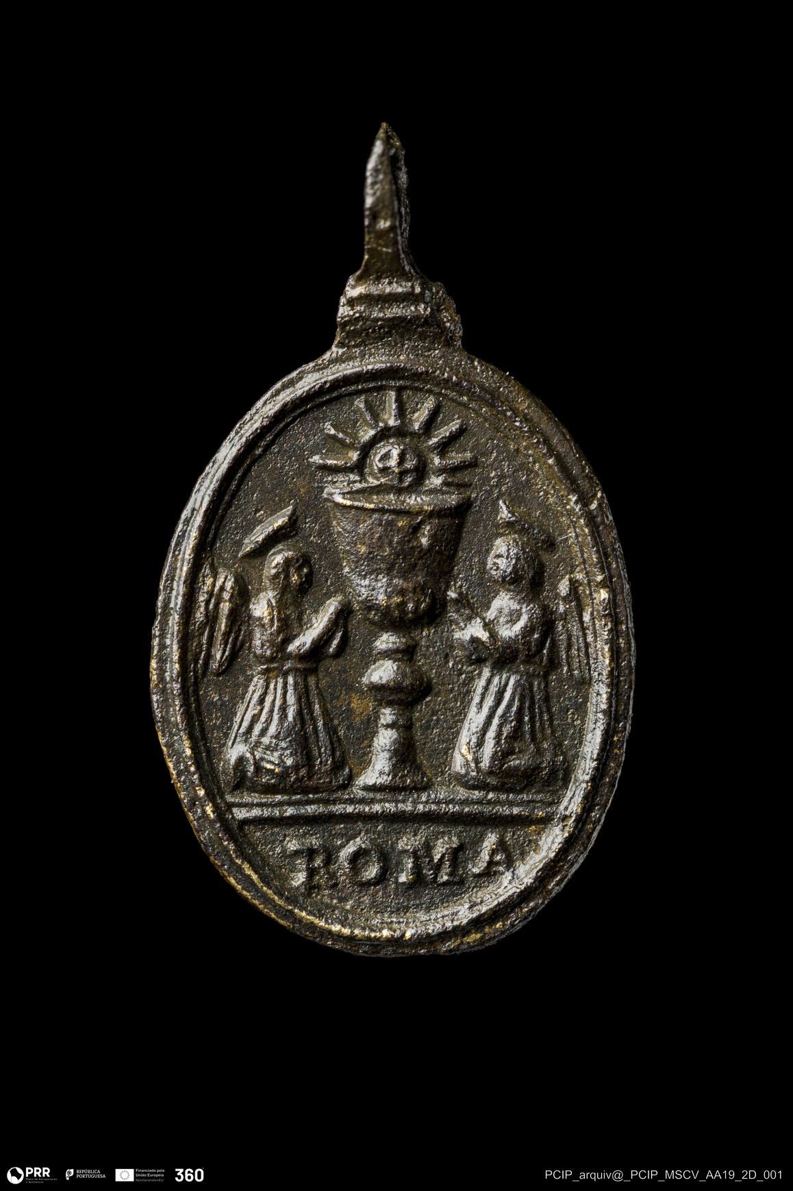 Matéria/Técnica: Liga de cobre; Cronologia: Final do Século XVI-Início do Século XVII (?); Autoria: Desconhecida; Dimensões: Largura: 15mm; Altura: 19mm.