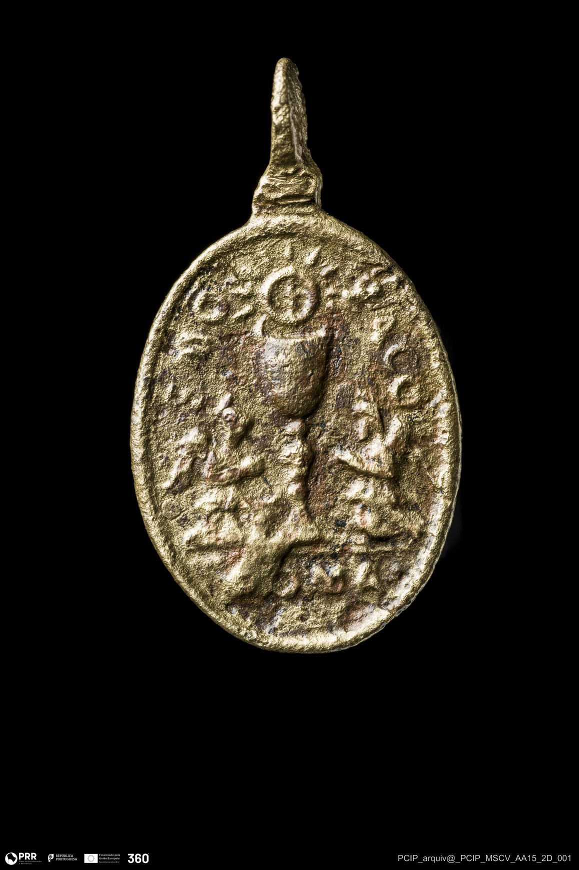 Matéria/Técnica: Liga de cobre; Cronologia: Final do século XVI- Início do Século XVII (?); Autoria: Desconhecida; Dimensões: Largura: 14mm Altura: 19mm.