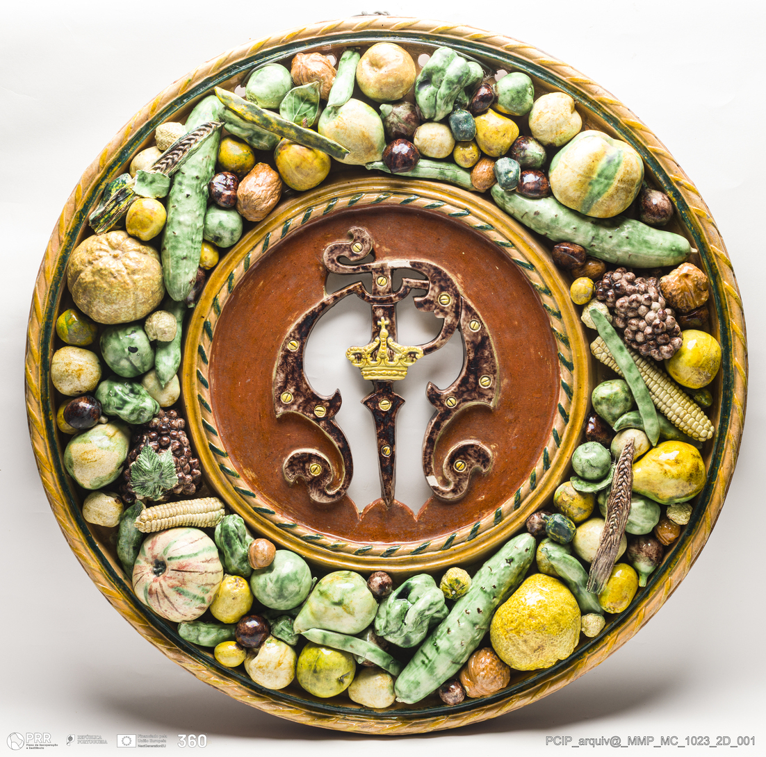 Matéria/Técnica: Barro modelado e moldado. Vidrado polícromo: castanho, amarelo, azul e verde; Cronologia: século XIX; Autoria: Desconhecido / Caldas da Rainha, Portugal; Dimensões (cm): Diâmetro: 60.