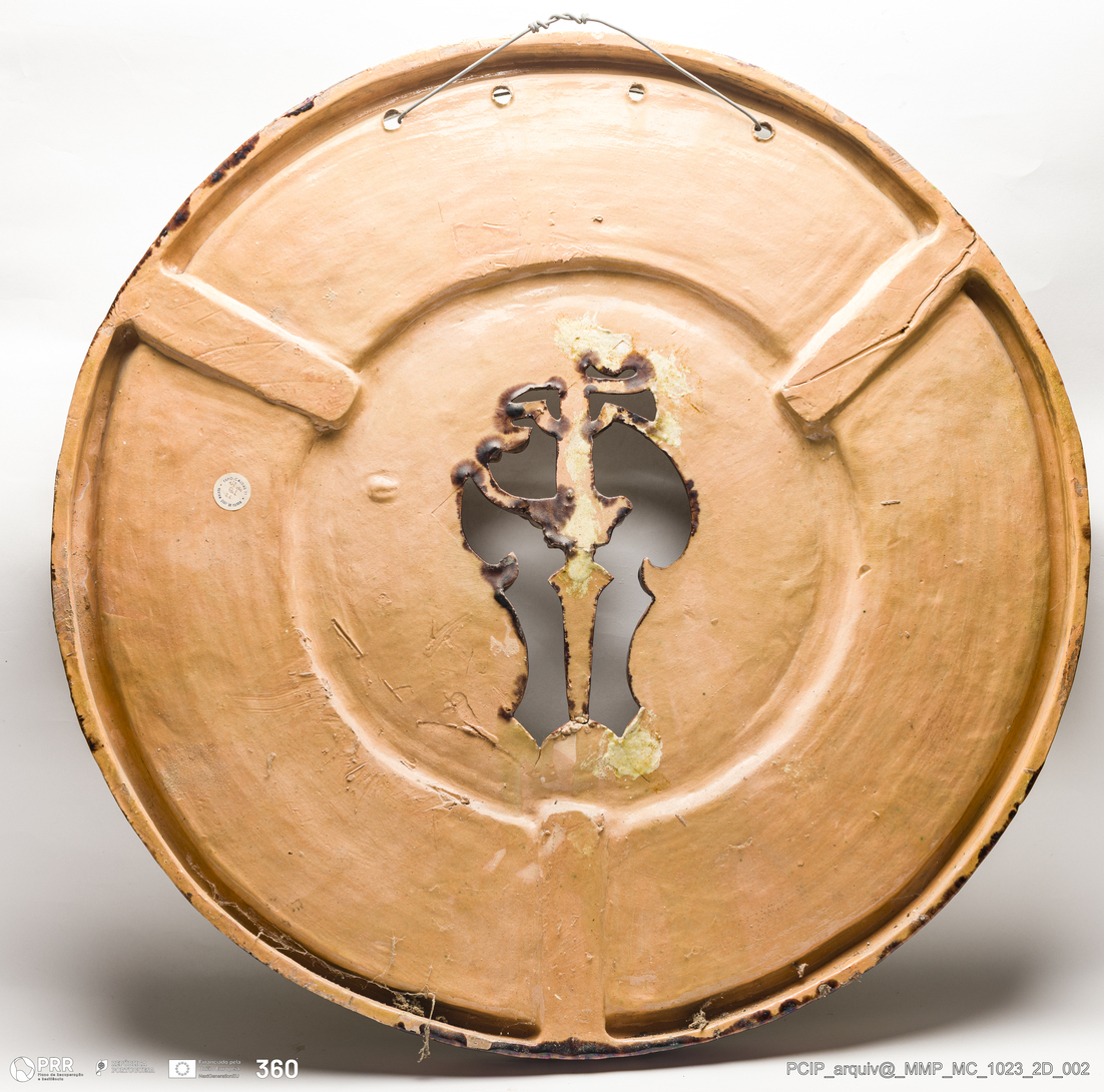 Matéria/Técnica: Barro modelado e moldado. Vidrado polícromo: castanho, amarelo, azul e verde; Cronologia: século XIX; Autoria: Desconhecido / Caldas da Rainha, Portugal; Dimensões (cm): Diâmetro: 60.