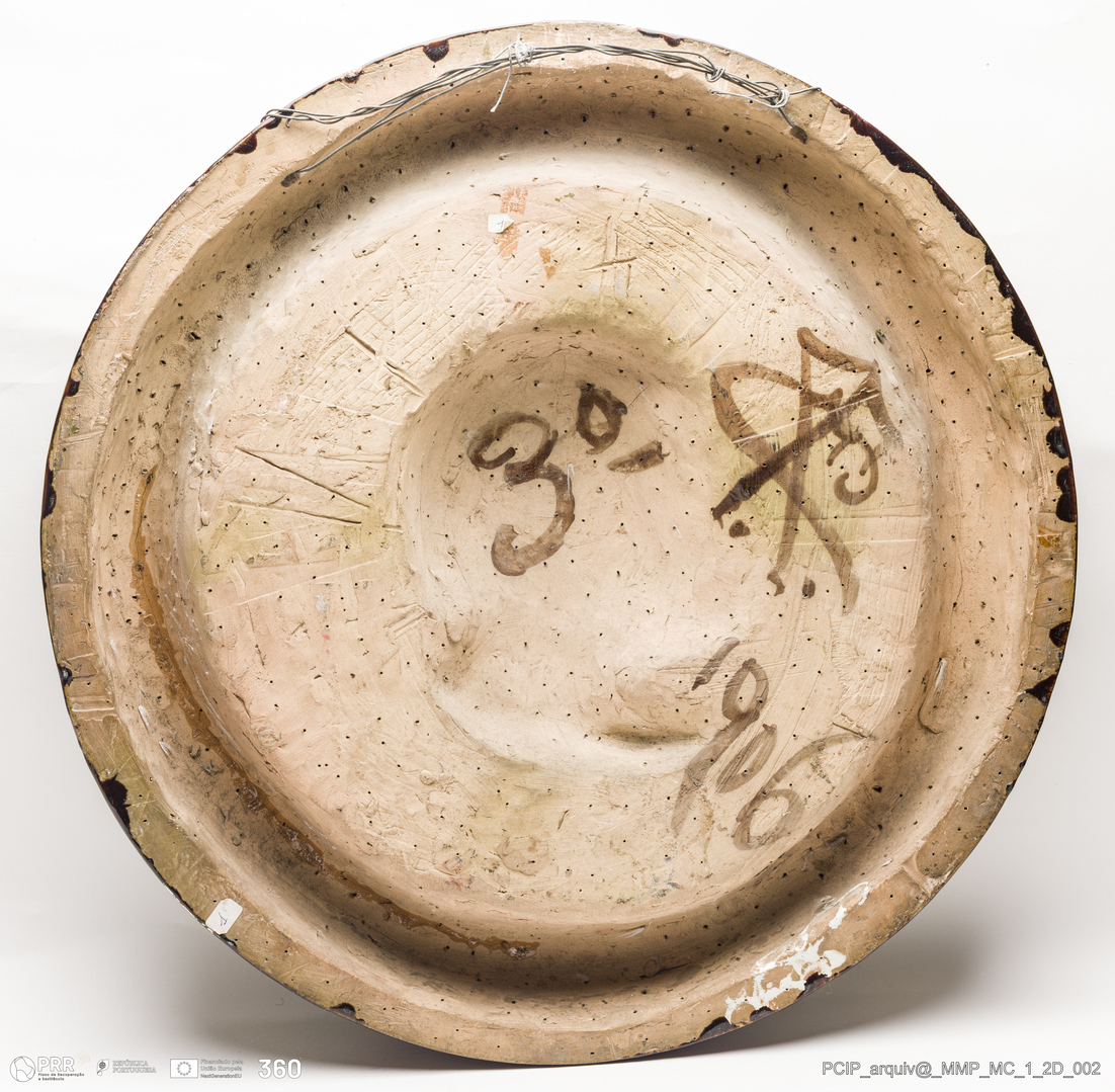 Matéria/Técnica: Barro moldado e modelado. Vidrado policromo: preto, castanho escuro e mel, verde, vermelho, amarelo e branco; Cronologia: 1905; Autoria: Manuel Gustavo Bordalo Pinheiro / Fábrica Bordalo Pinheiro / Caldas da Rainha; Dimensões (cm): Altura: 7,5; Diâmetro: 51,5.