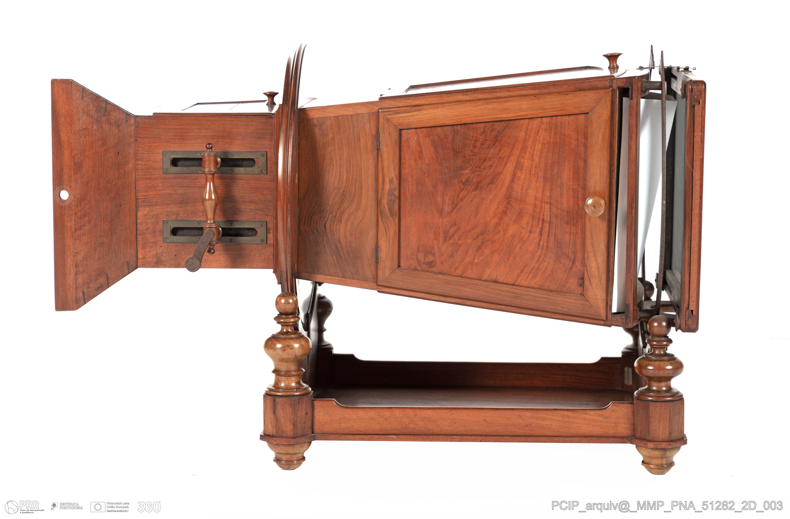 Matéria/Técnica: Madeira, metal, ferro, vidro, espelho; Cronologia: 1859 - 1862; Autoria: Ponti, Carlo; Dimensões (cm): Altura: 73; Largura: 90; Profundidade: 49.