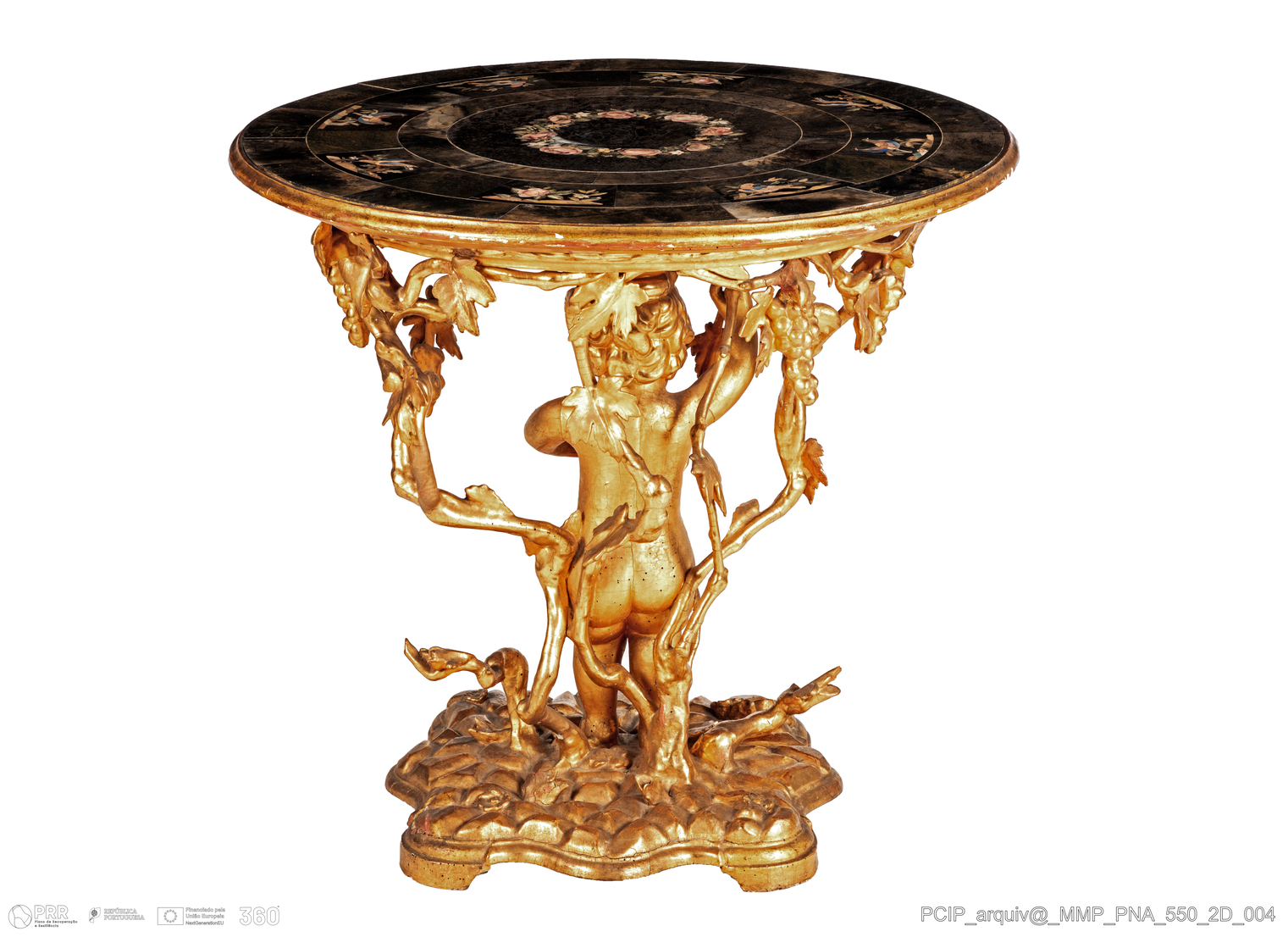 Matéria/Técnica: Madeira; folha de ouro; cálcários; mármore; quartzo rosa; Cronologia: 1860 - 1890; Autoria: Desconhecida; Dimensões (cm): Altura: 84; Diâmetro: 88.