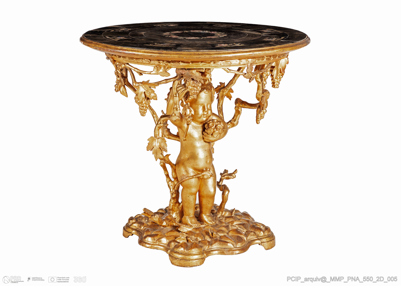 Matéria/Técnica: Madeira; folha de ouro; cálcários; mármore; quartzo rosa; Cronologia: 1860 - 1890; Autoria: Desconhecida; Dimensões (cm): Altura: 84; Diâmetro: 88.