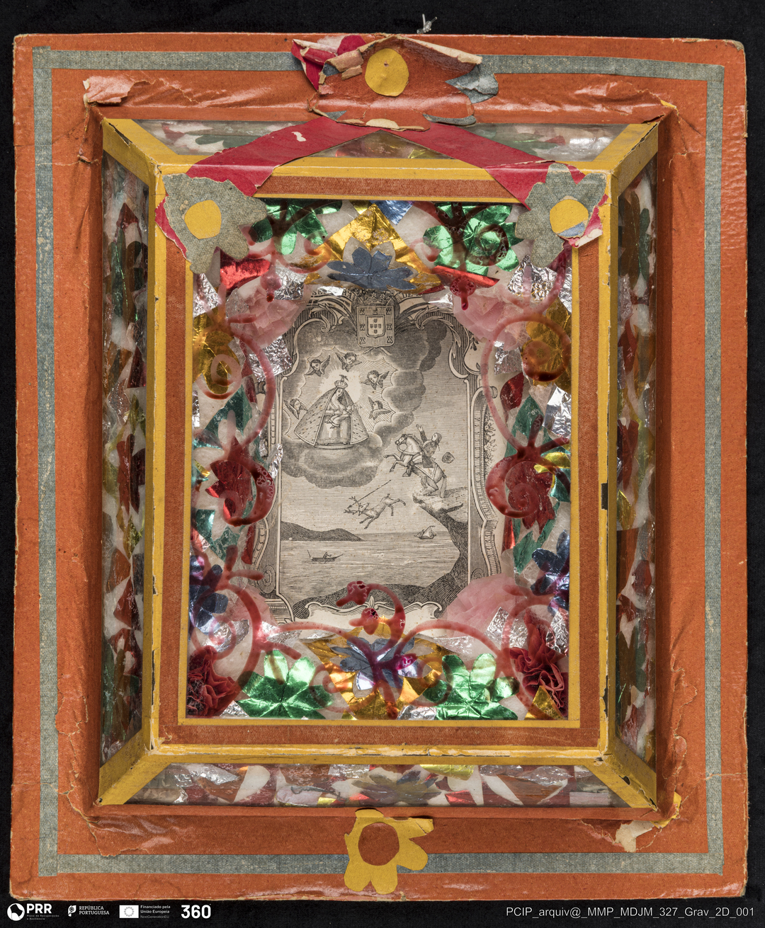 Matéria/Técnica: Papel (trabalho artístico popular, montada em cartão e vidro); Cronologia: Séc. XX; Autoria: Virgínia Teixeira Peixoto; Dimensões: Altura: 32,6 cm x Largura: 24,9 cm.