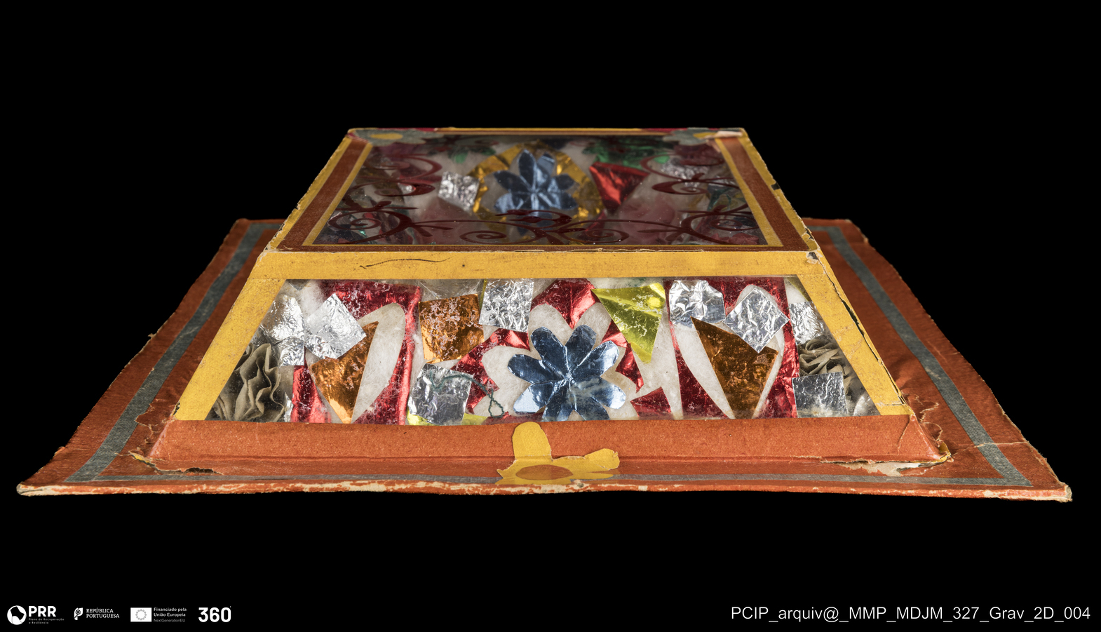 Matéria/Técnica: Papel (trabalho artístico popular, montada em cartão e vidro); Cronologia: Séc. XX; Autoria: Virgínia Teixeira Peixoto; Dimensões: Altura: 32,6 cm x Largura: 24,9 cm.