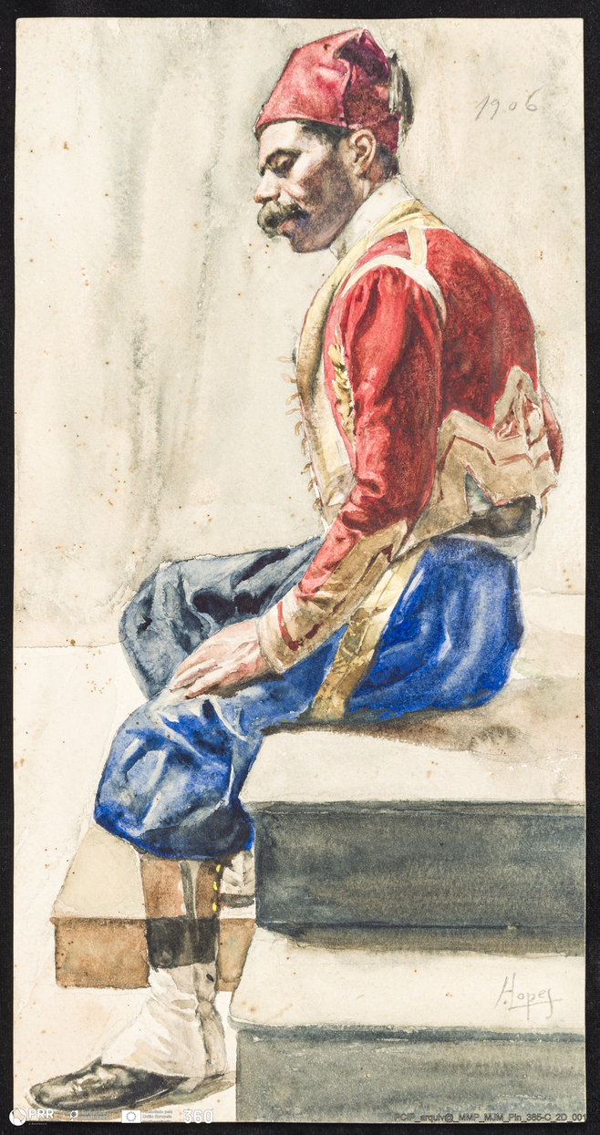 Matéria/Técnica: Aguarela; Cronologia: 1916; Autoria: Hermenegildo Lopes; Dimensões: 34 x 17,5 cm.
