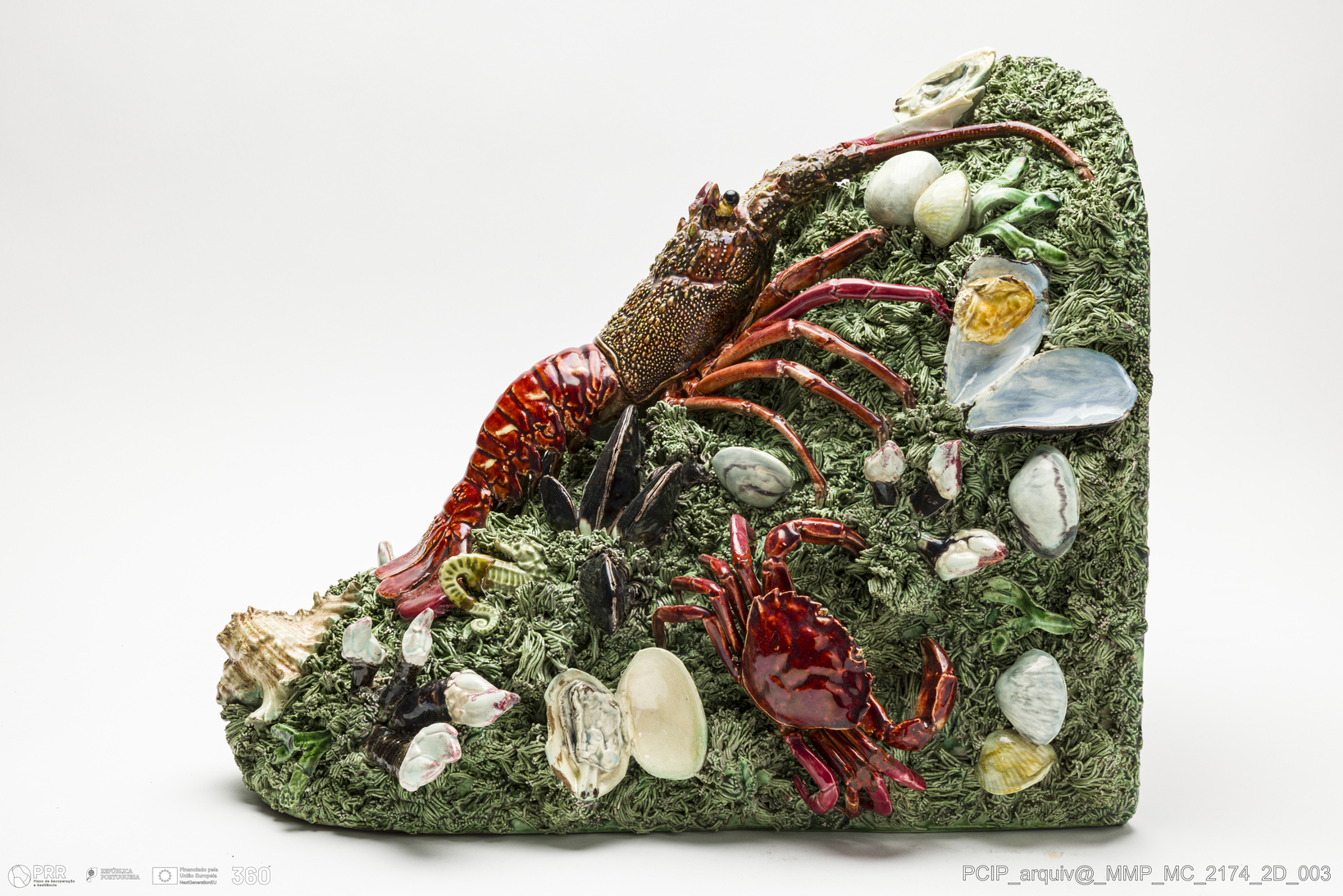 Matéria/Técnica: Barro branco moldado e modelado. Vidrado polícromo: verde, magenta, azul, branco, cinzento, preto, castanho escuro, claro e mel. Musgado; Cronologia: 1899; Autoria: Avelino António Soares Bello / Caldas da Rainha; Dimensões (cm): Altura: 42; Largura: 30; Comprimento: 35.