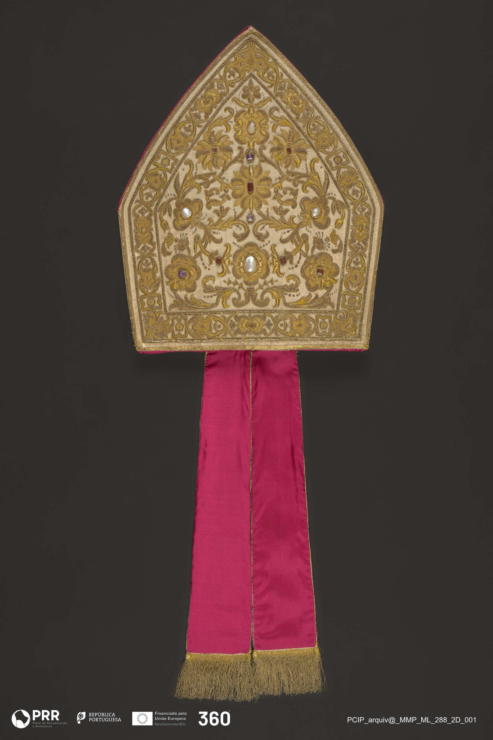 Matéria/Técnica: Bordado: fio de ouro estendido, canutilho, cordão; aplicação de cordãozinho a rodear os motivos; aplicação de pedras com engaste metálico, fixação de ornato em madrepérola Galão bordado definido pela aplicação de várias linhas de cordãozinho e cordão mais; Cronologia: Século XVIII; Autoria: Desconhecida; Dimensões (cm): Altura: 41,5 x Largura: 31( base).