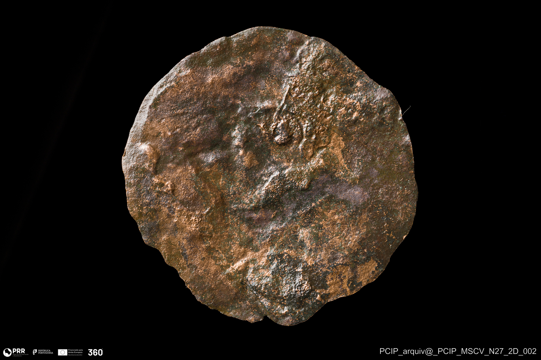 Matéria/Técnica: Metal; Cronologia: Indeterminada; Autoria: Desconhecida; Dimensões: Diâmetro: 36mm; Espessura: 1mm.