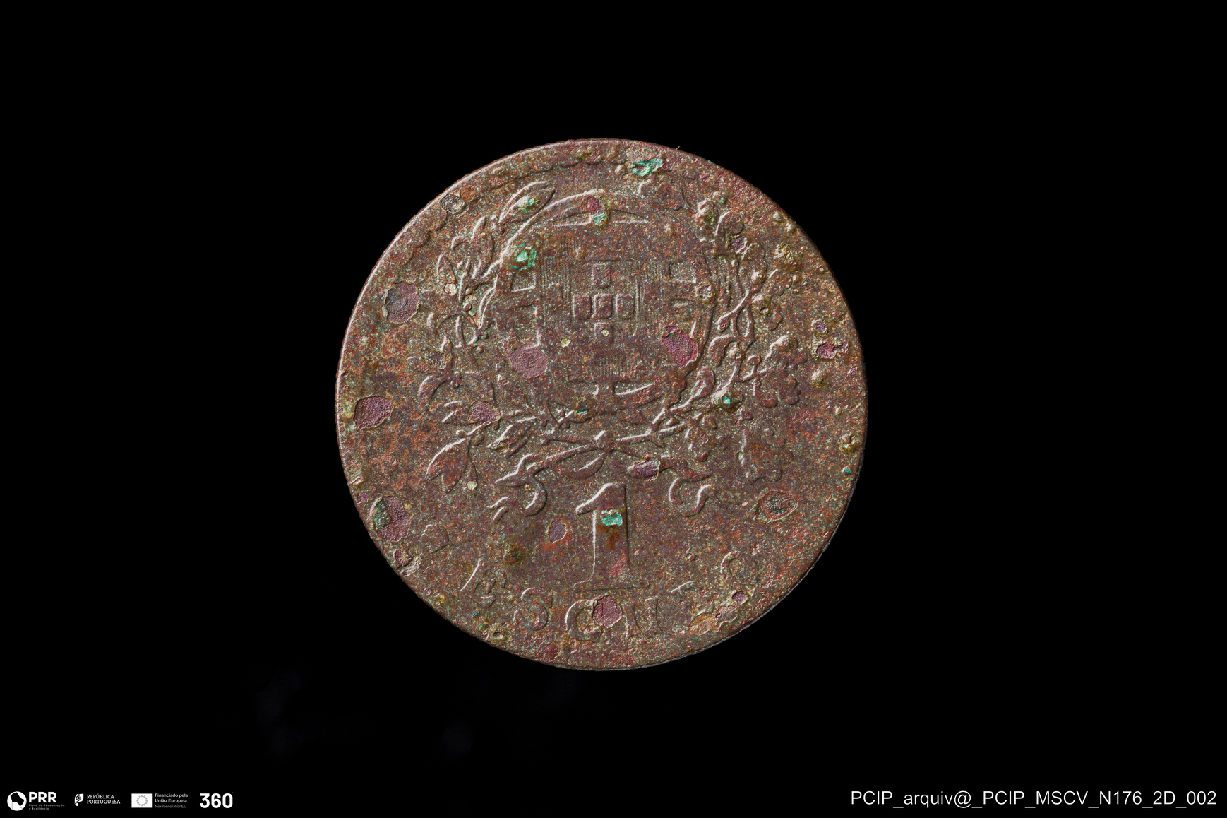 Matéria/Técnica: Metal; Cronologia: Indeterminada; Autoria: Desconhecida; Dimensões: Diâmetro: 27mm; Espessura: 2mm.