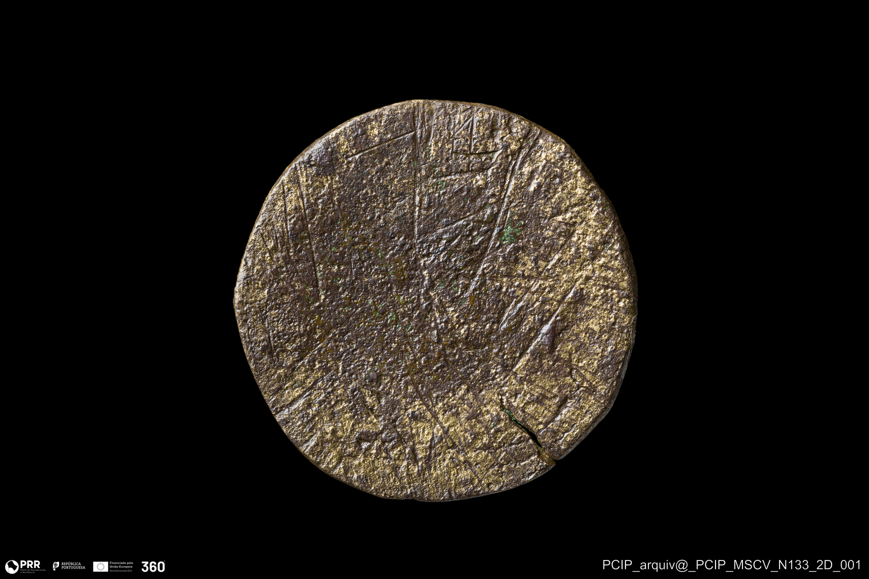 Matéria/Técnica: Metal; Cronologia: Indeterminada; Autoria: Desconhecida; Dimensões: Diâmetro: 20mm; Espessura: 1mm.
