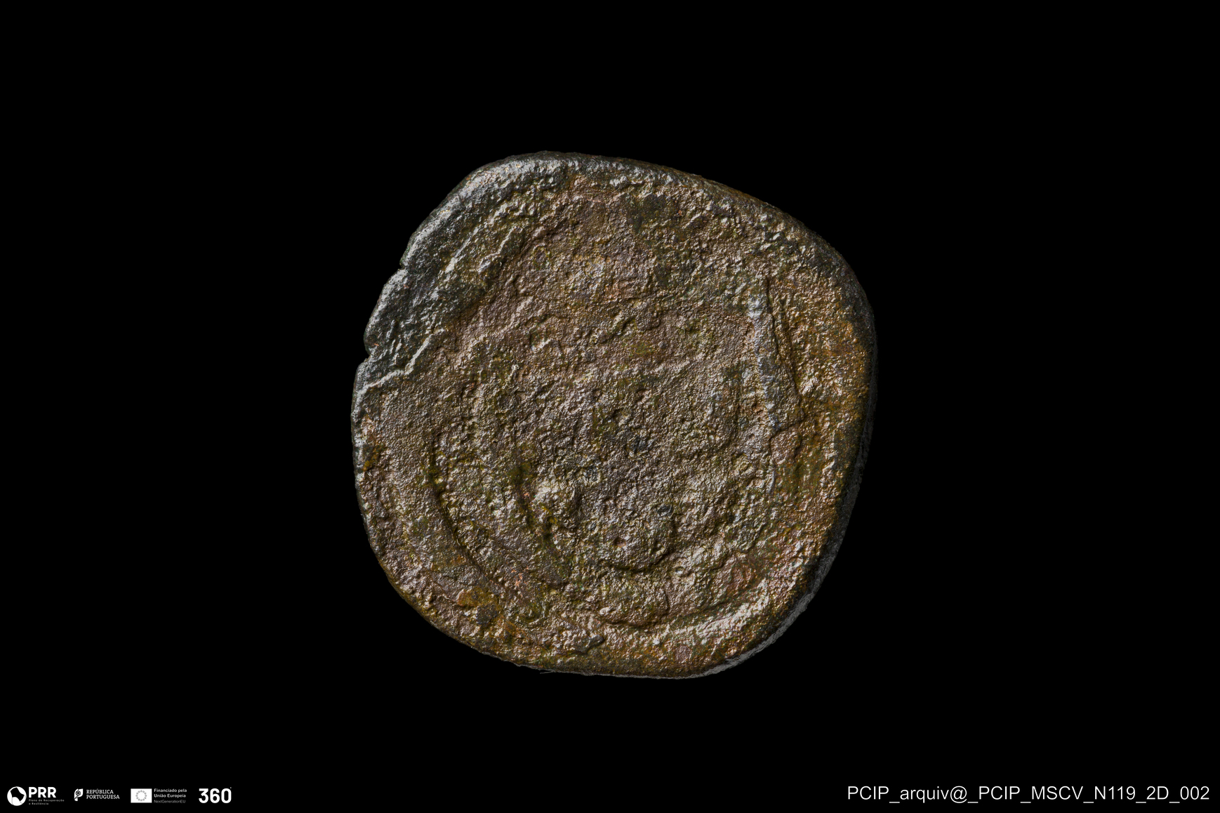 Matéria/Técnica: Metal; Cronologia: Indeterminada; Autoria: Desconhecida; Dimensões: Diâmetro: 18mm; Espessura: 1mm.