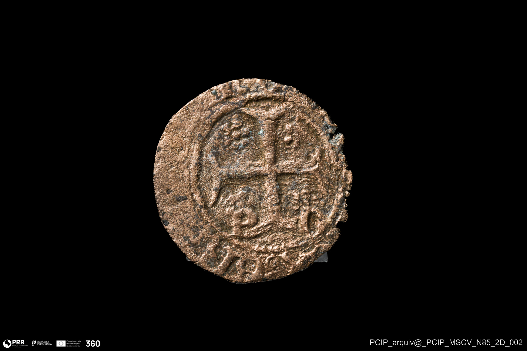 Matéria/Técnica: Bolhão (liga de prata e cobre); Cronologia: Século XIV- Século XV (?); Autoria: Desconhecida; Dimensões: Diâmetro: 14mm.