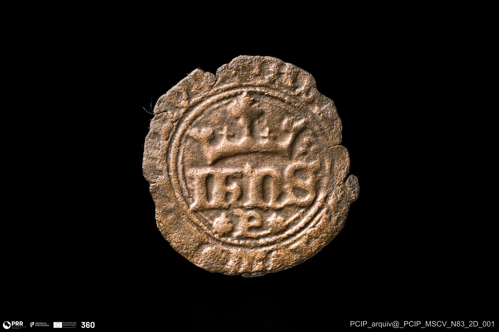 Matéria/Técnica: Bolhão (liga de prata e cobre) ?; Cronologia: Século XIV- Século XV; Autoria: Desconhecida; Dimensões: Diâmetro: 17mm.