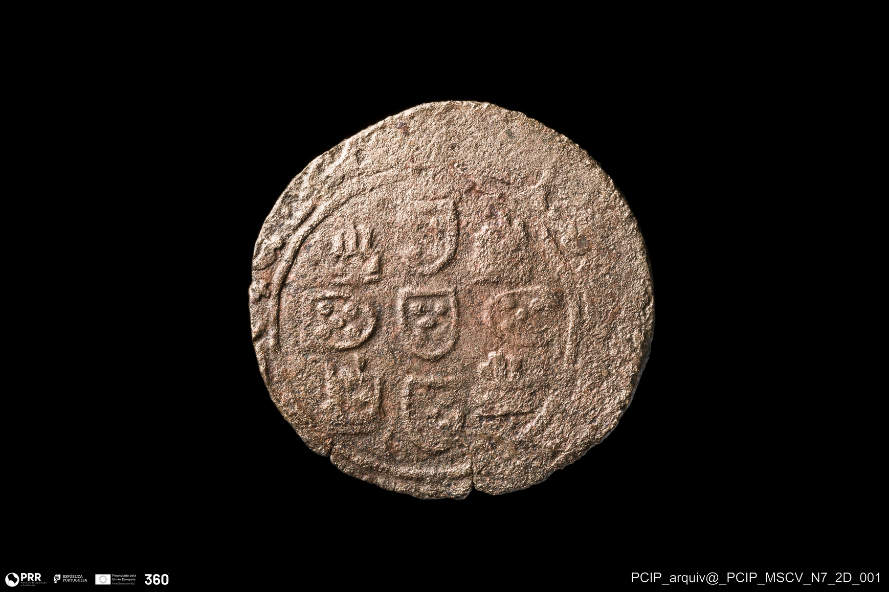 Matéria/Técnica: Bolhão (liga de prata e cobre) ?; Cronologia: Século XIV - Século XV (?); Autoria: Desconhecida; Dimensões: Diâmetro: 23mm.