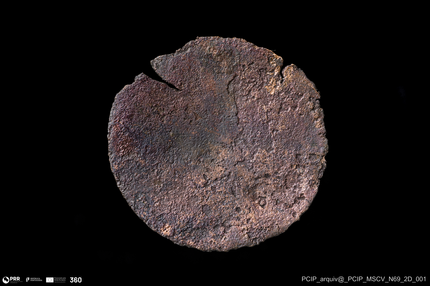Matéria/Técnica: Metal; Cronologia: Indeterminada; Autoria: Desconhecida; Dimensões: Diâmetro: 27mm; Espessura: 1mm.