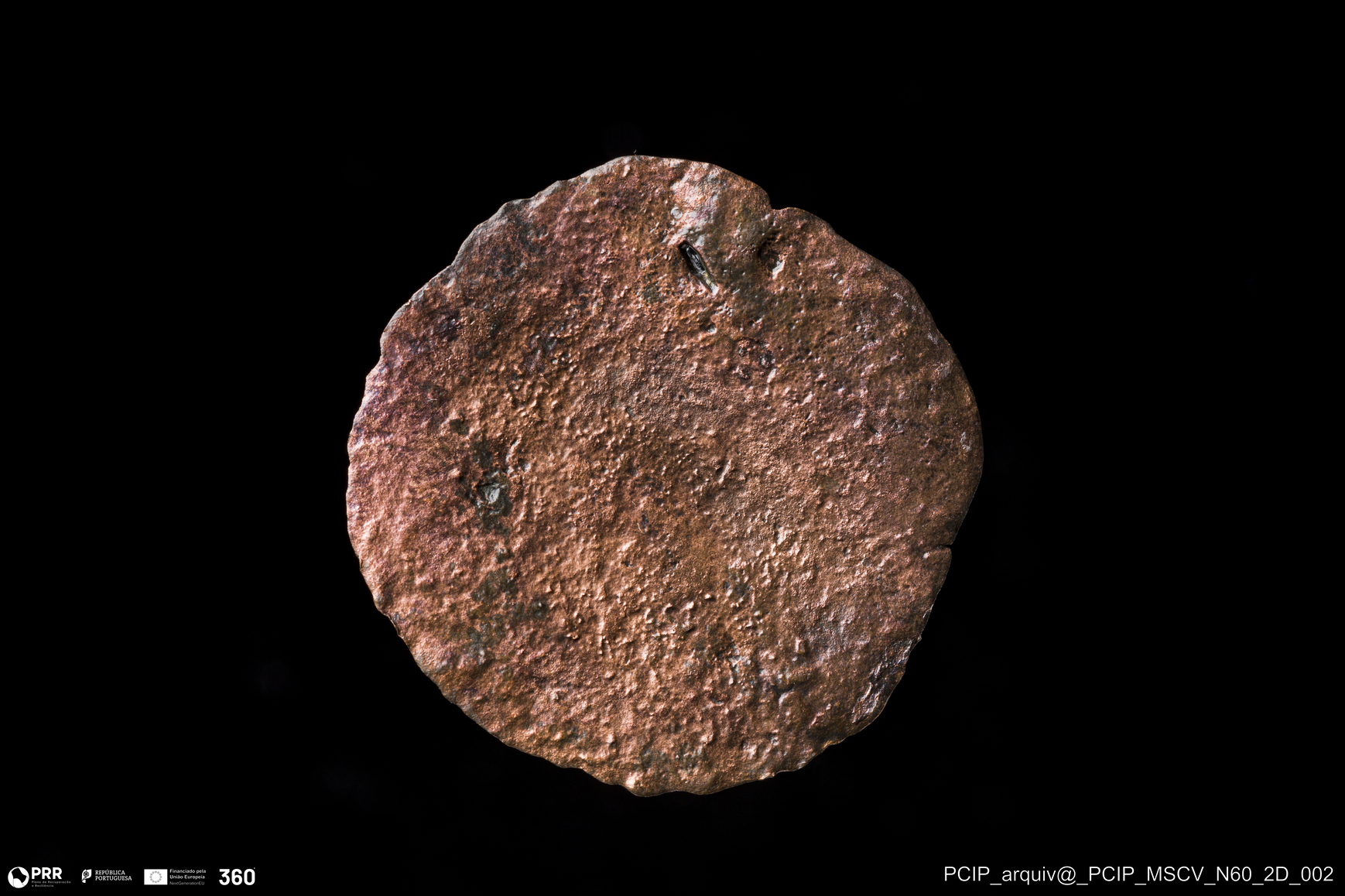Matéria/Técnica: Metal; Cronologia: Indeterminada; Autoria: Desconhecida; Dimensões: Diâmetro: 26mm; Espessura: <0,5mm.
