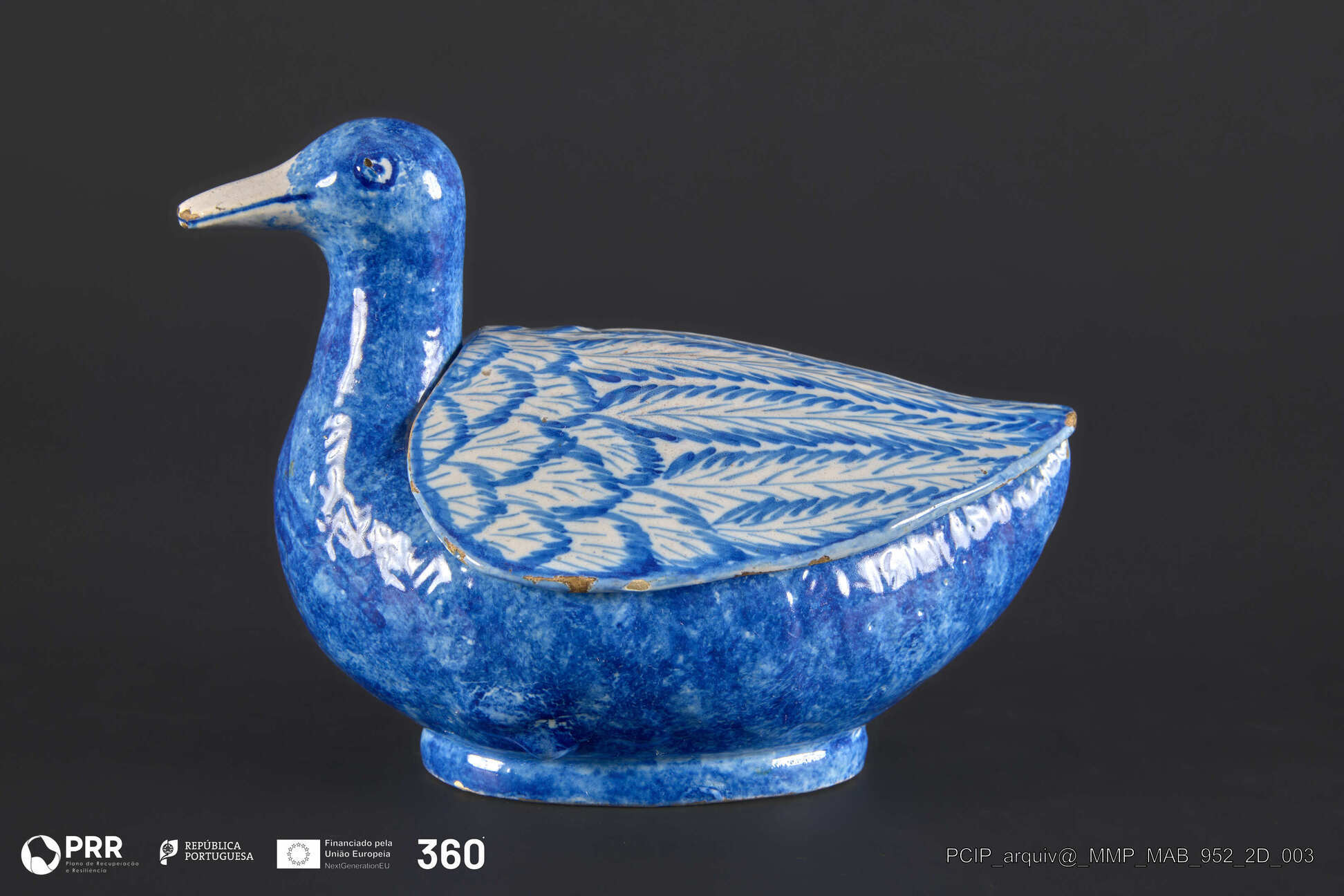 Matéria/Técnica: Peça moldada, vidrada, esponjada e pintada a azul sobre fundo branco; Cronologia: Desconhecida; Autoria: Desconhecida; Dimensões: Desconhecidas.