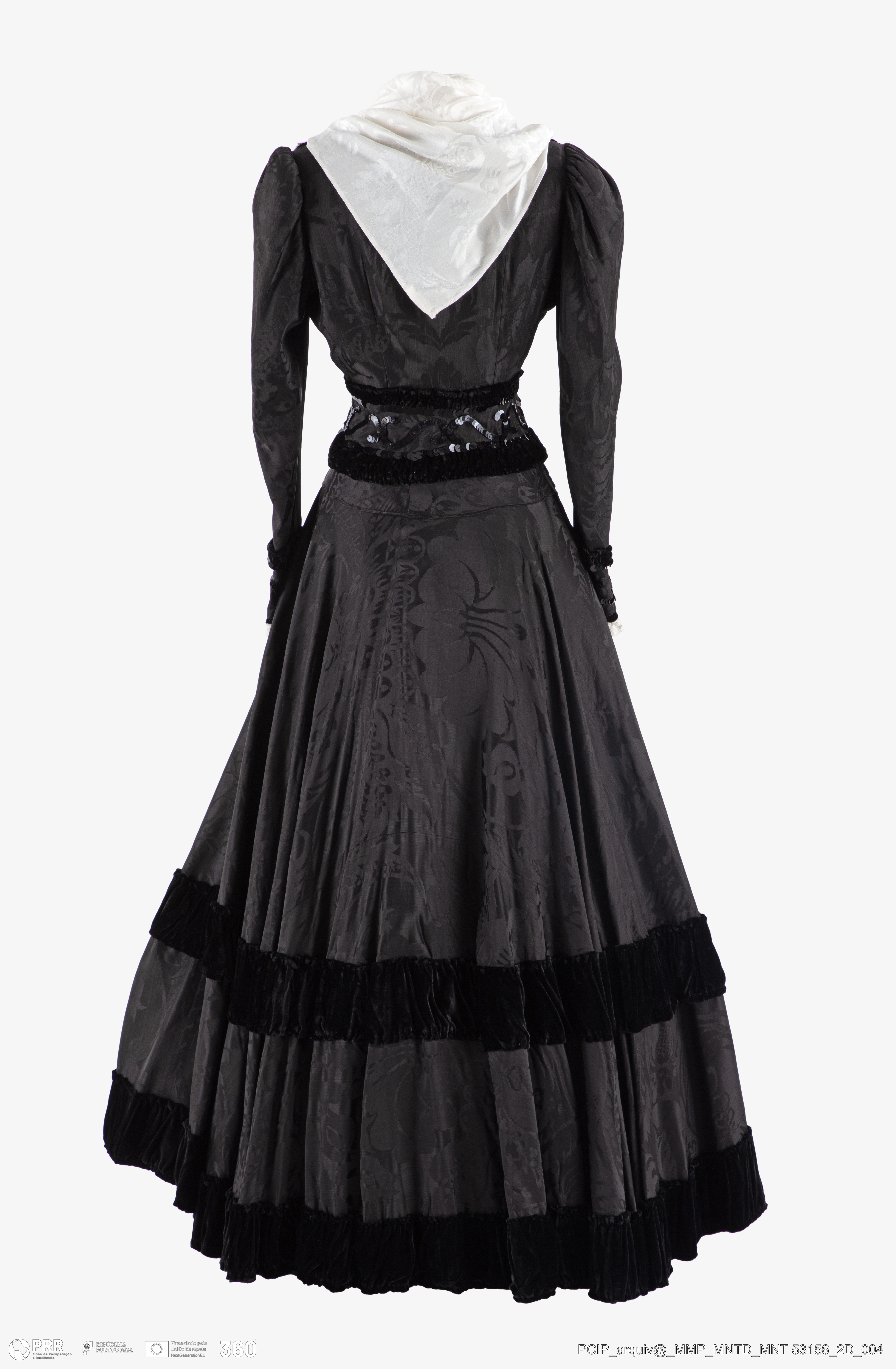 Matéria/Técnica: Tafetá; renda; bordado aplicado.; Cronologia: 1946; Autoria: Pinto de Campos; Dimensões (cm): Altura: 160 x Largura: 37.