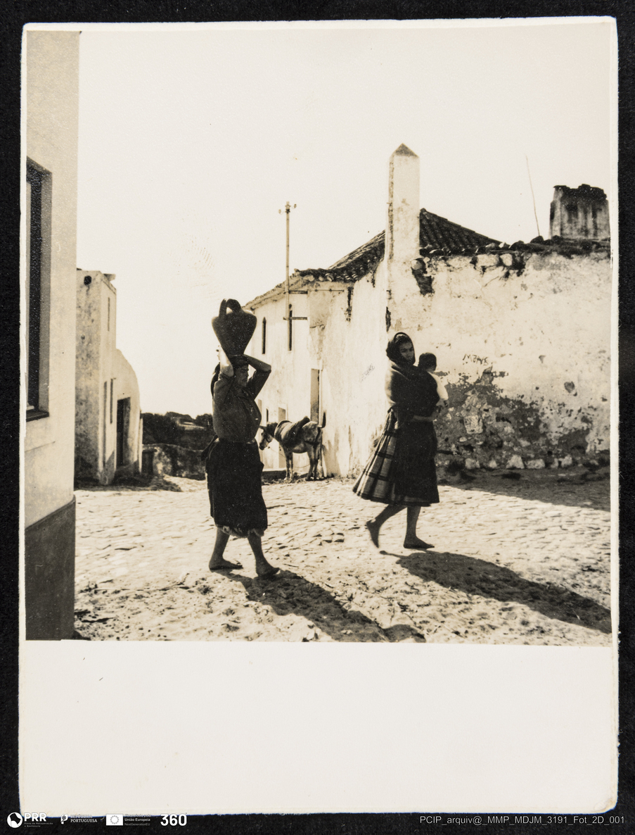 Mulher com cântaro de água à cabeça numa rua da pederneira