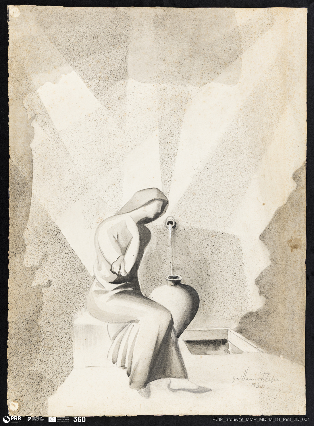 Matéria/Técnica: Aguarela e lápis sobre papel; Cronologia: 1931; Autoria: Guilherme Filipe; Dimensões: Altura: 62,5 cm x Largura: 49,5 cm.