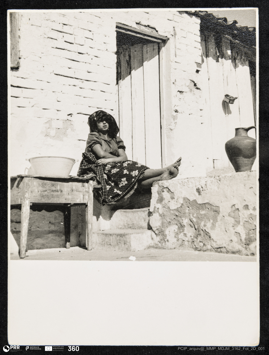 Documento simples. MDJM_3162_Fot_2D_001 - Mulher sentada ao sol no pátio do Casal das Figueiras
