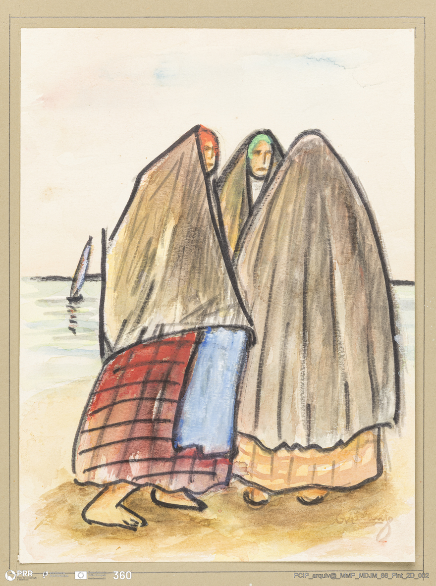 Matéria/Técnica: Aguarela sobre papel; Cronologia: 1952; Autoria: António Vitorino Laranjo; Dimensões: Altura: 13,7 cm x Largura: 10,8 cm.