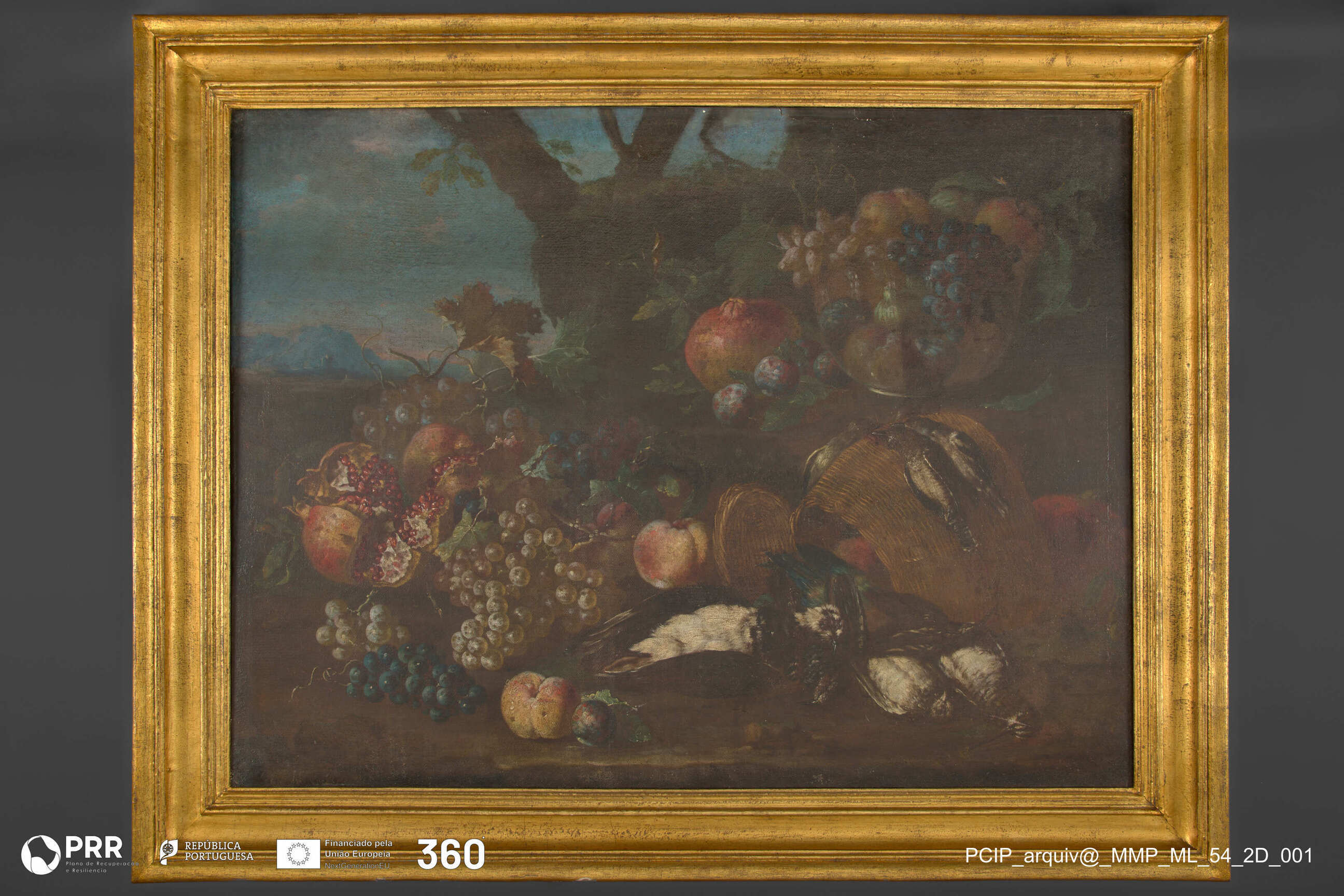 Natureza-morta c/ frutos, cesto e pássaros numa paisagem