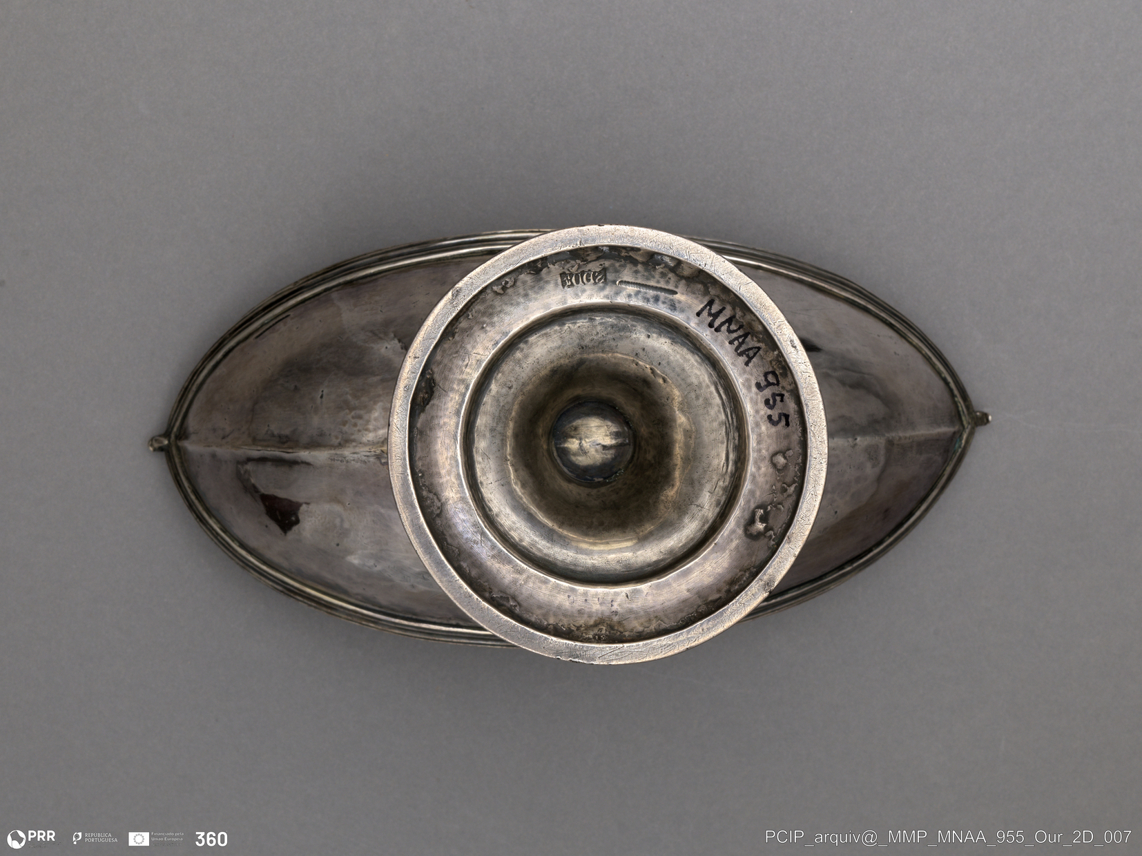 Matéria/Técnica: prata lisa batida e fundida; Cronologia: 1541-1560; Autoria: Desconhecida; Dimensões: Altura: 10 cm x Largura: 9 cm x Comprimento: 18,9 cm.