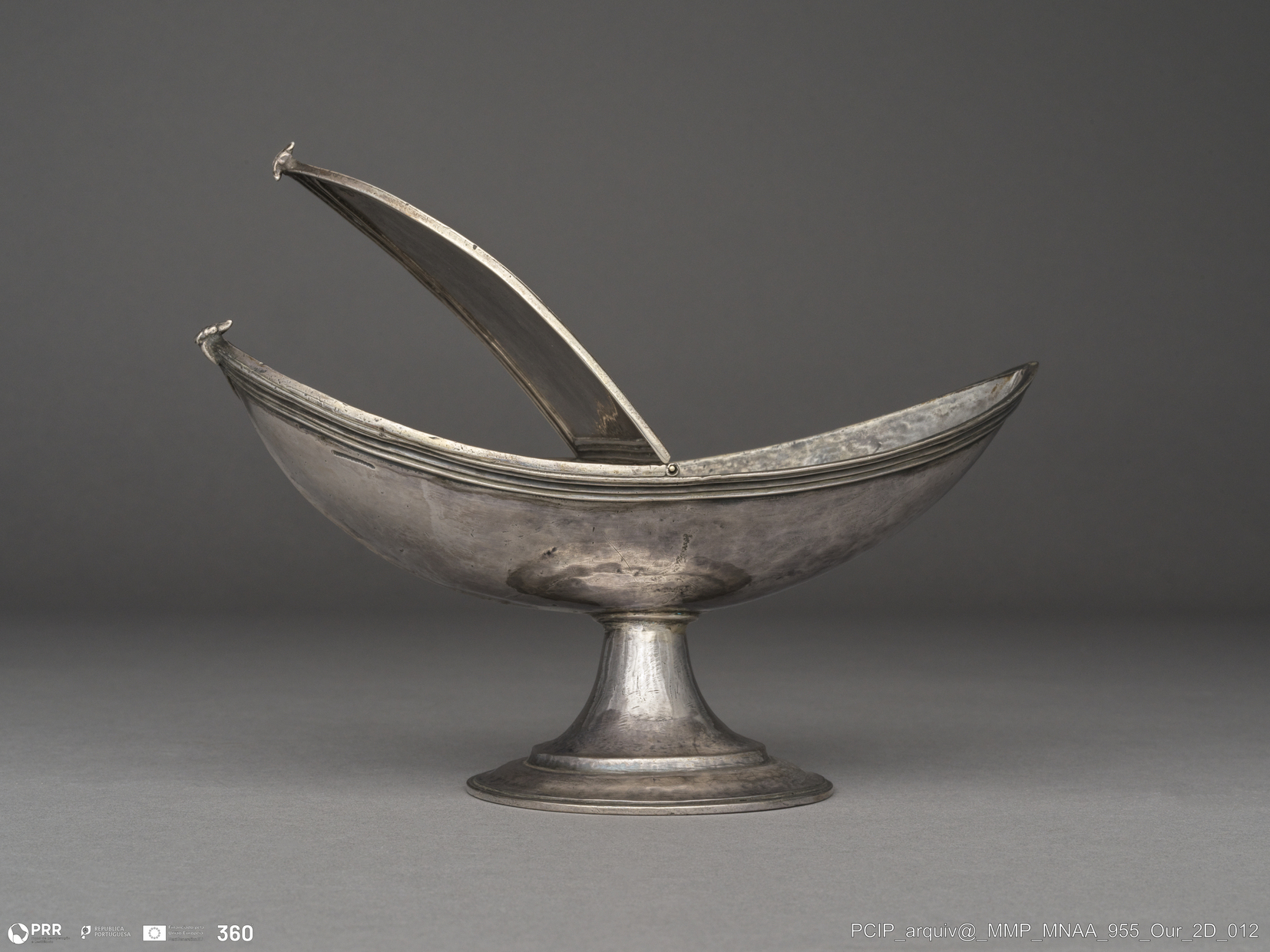 Matéria/Técnica: prata lisa batida e fundida; Cronologia: 1541-1560; Autoria: Desconhecida; Dimensões: Altura: 10 cm x Largura: 9 cm x Comprimento: 18,9 cm.