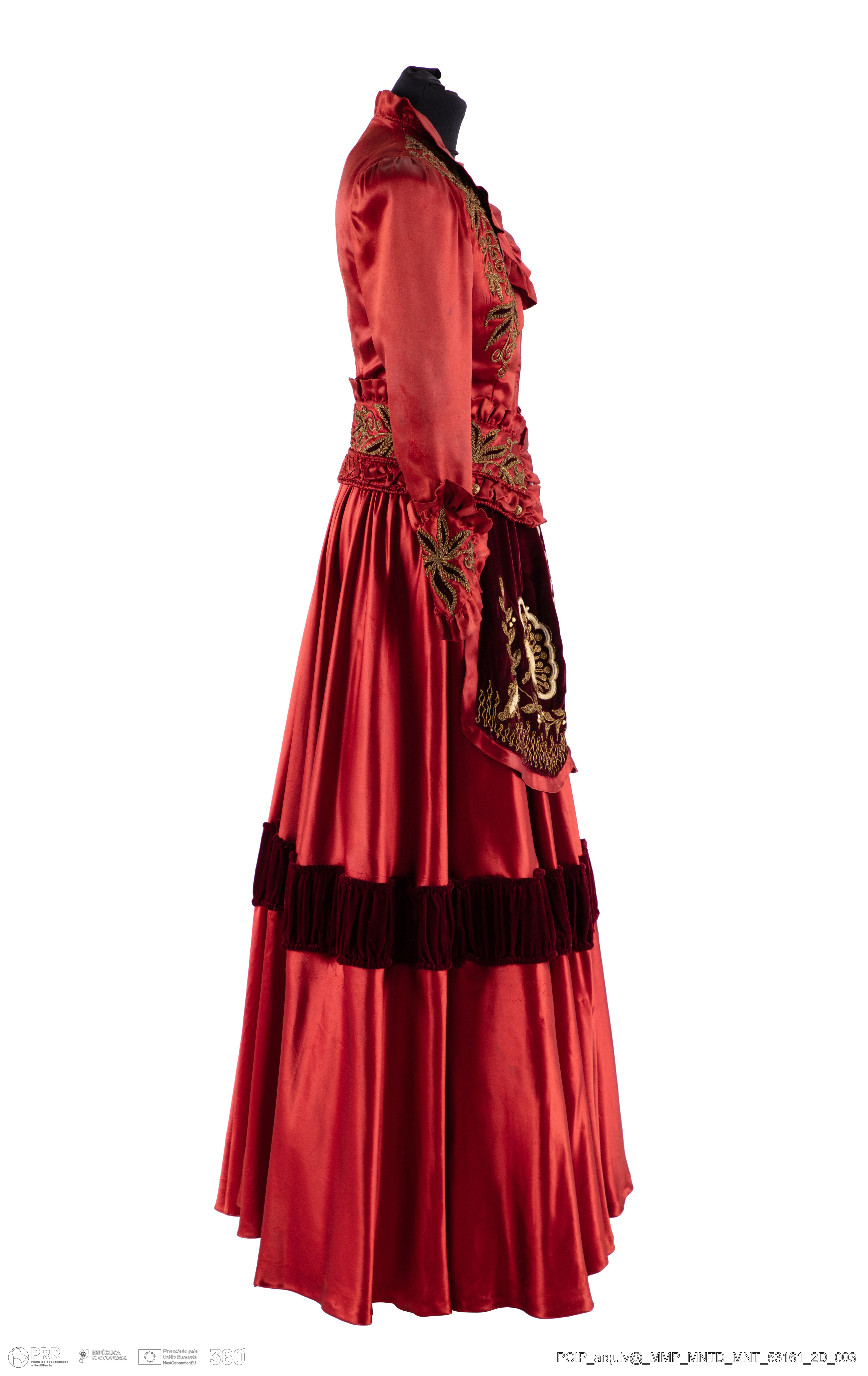 Matéria/Técnica: Cetim; tafetá; sarja; bordado.; Cronologia: 1944; Autoria: Pinto de Campos; Dimensões (cm): Altura: 55 cm(corpo), 110 cm (saia), 50 cm (avental) x Largura: 38 cm (corpo), 70 cm (saia), 60 cm (avental).