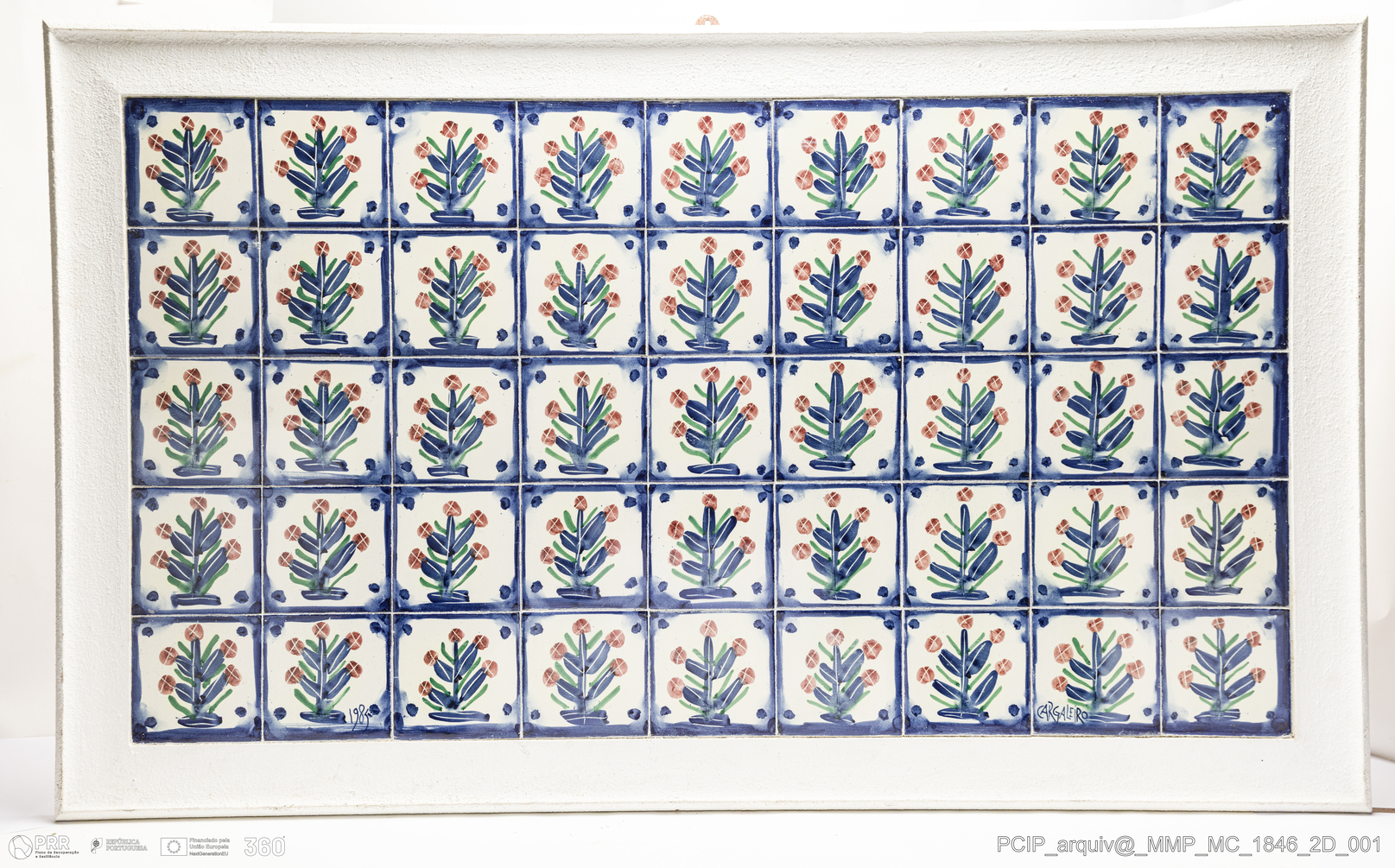Matéria/Técnica: Barro branco moldado. Pintura de esmalte estanifero cru sobre Barro cozido. Vidrado polícromo azul, verde e manganés; Cronologia: 1985; Autoria: Manuel Alves Cargaleiro / Fábrica Cerâmica Viúva Lamego, Lisboa, Portugal; Dimensões (cm): Altura: 71; Largura: 1280.