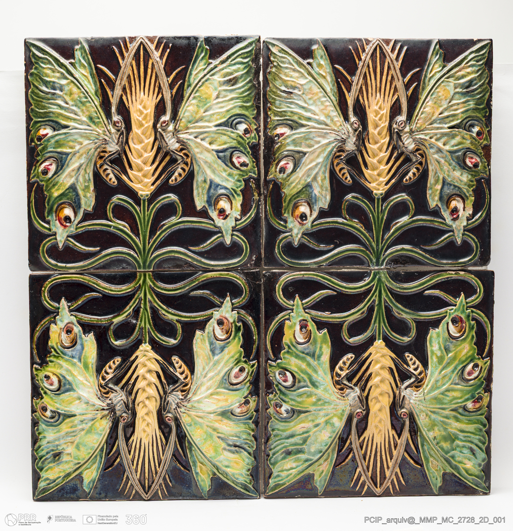 Matéria/Técnica: Barro vermelho moldado. Vidrado polícromo: verde, azul e amarelo sobre fundo castanho escuro; Cronologia: 1905; Autoria: Rafael Bordalo Pinheiro / Fábrica de Faianças das Caldas da Rainha, Portugal; Dimensões (cm): Altura: 29; Comprimento: 28.