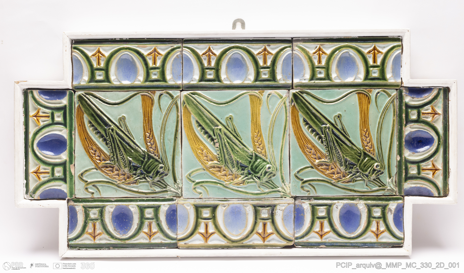 Matéria/Técnica: Barro vermelho moldado. Vidrado polícromo: verde, cor de mel, azul e branco; Cronologia: 1905; Autoria: Rafael Bordalo Pinheiro / Fábrica de Faianças das Caldas da Rainha, Portugal; Dimensões (cm): Altura: 25; Largura: 50.