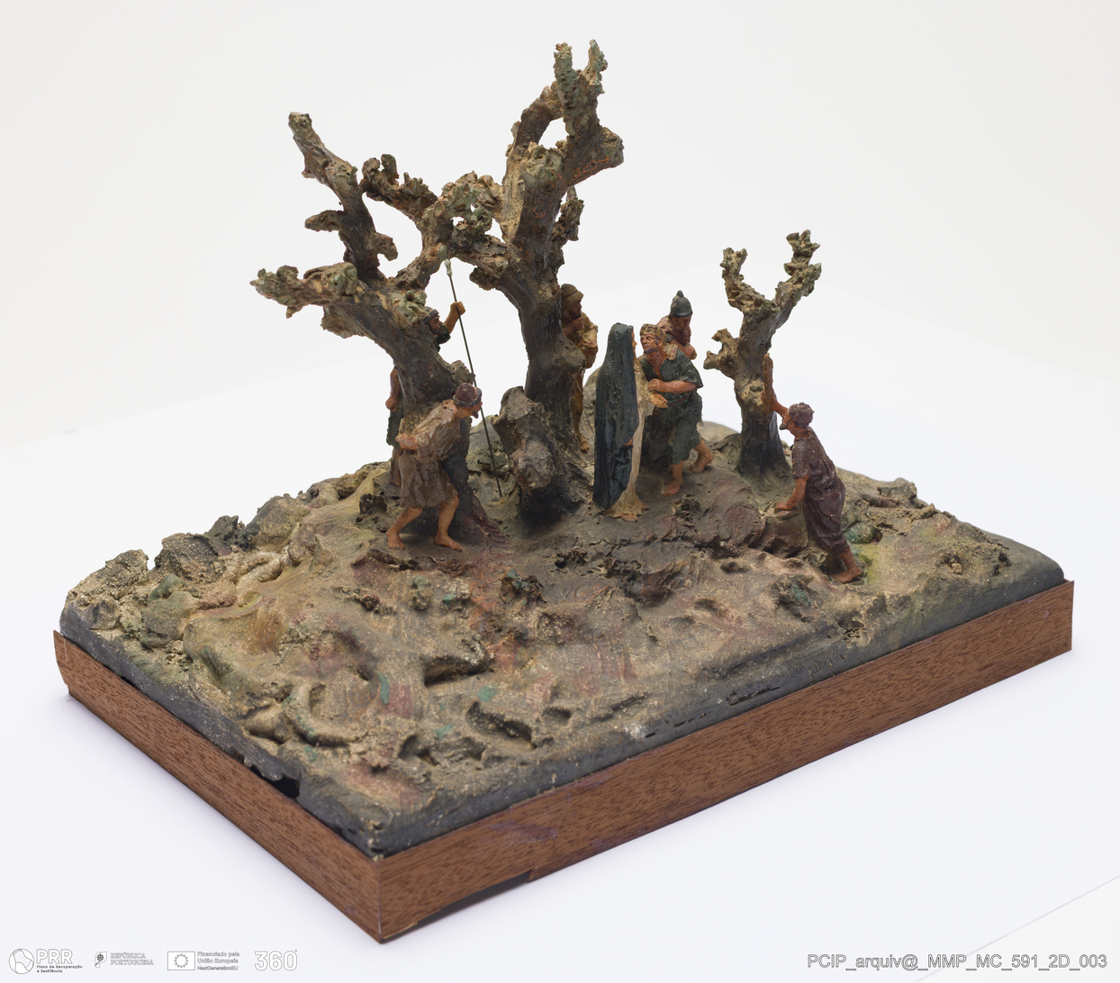Matéria/Técnica: Barro branco modelado, sobre base de madeira. Pintura a frio polícroma: castanho, verde, azul, branco; Cronologia: 1916; Autoria: Francisco Elias / Caldas da Rainha, Portugal; Dimensões (cm): Altura: 16; Largura: 22.