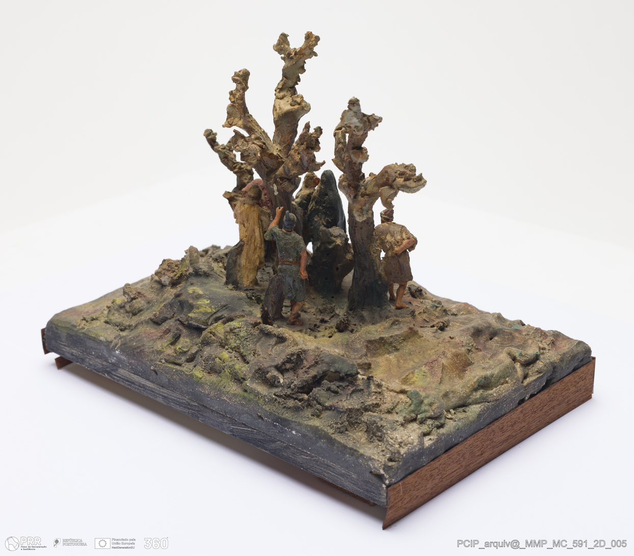 Matéria/Técnica: Barro branco modelado, sobre base de madeira. Pintura a frio polícroma: castanho, verde, azul, branco; Cronologia: 1916; Autoria: Francisco Elias / Caldas da Rainha, Portugal; Dimensões (cm): Altura: 16; Largura: 22.
