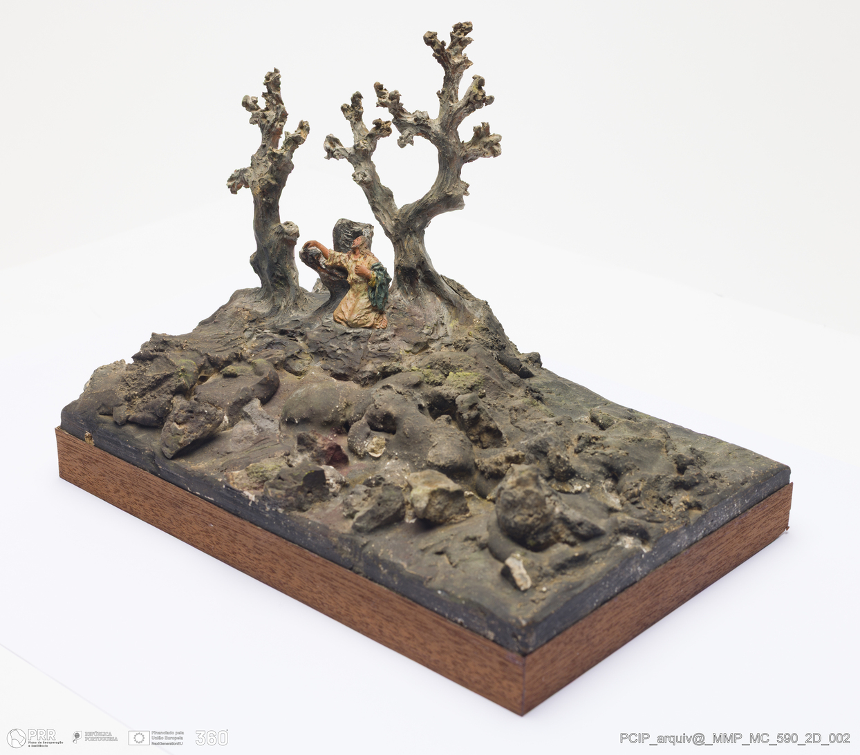 Matéria/Técnica: Barro branco e vermelho modelado, sobre base de madeira. Pintura a frio polícroma: castanho, amarelo e verde; Cronologia: 1911; Autoria: Francisco Elias / Caldas da Rainha, Portugal; Dimensões (cm): Altura: 15; Largura: 14,5; Comprimento: 23 base 1,5x15x23.